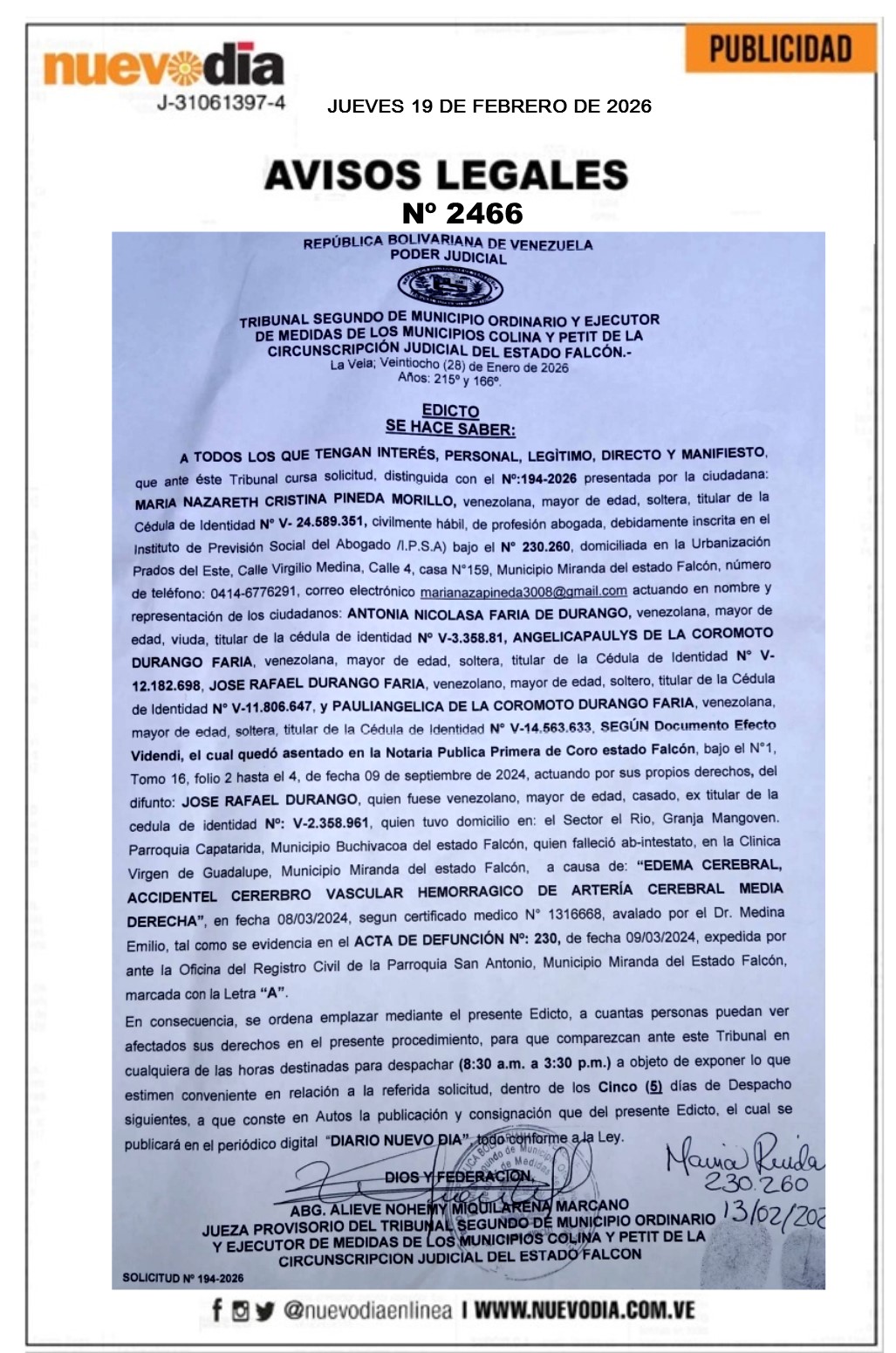 InicioPublicidadLegales PublicidadLegales Edicto.José Rafael Durango. 19/02/2026 FacebookTwitterPinterestWhatsApp 2466. 19-02-2026 Cuota FacebookTwitterPinterestWhatsApp Artículo anteriorDelcy Rodríguez anuncia encuentro de alto nivel con PetroArtículo siguienteCongreso de Perú elige a José María Balcázar como presidente interino Mercadeo NuevoDia Noticias Relacionadas Legales Cartel de Notificación.Unión de Conductores Sucre Sociedad Civil. Legales Edicto.Jesús Manuel Ravelo Abreu. Legales Edicto.Julio César Riera Aular. Redes Sociales20,299FansMe gusta112,425SeguidoresSeguir4,600SuscriptoresSuscribirte Últimas noticias Destacadas Jefe del Comando Sur de EE.UU. visitó Caracas para sostener una reunión con Delcy Rodríguez Destacadas Delcy Rodríguez anuncia encuentro de alto nivel con Petro Cargar más