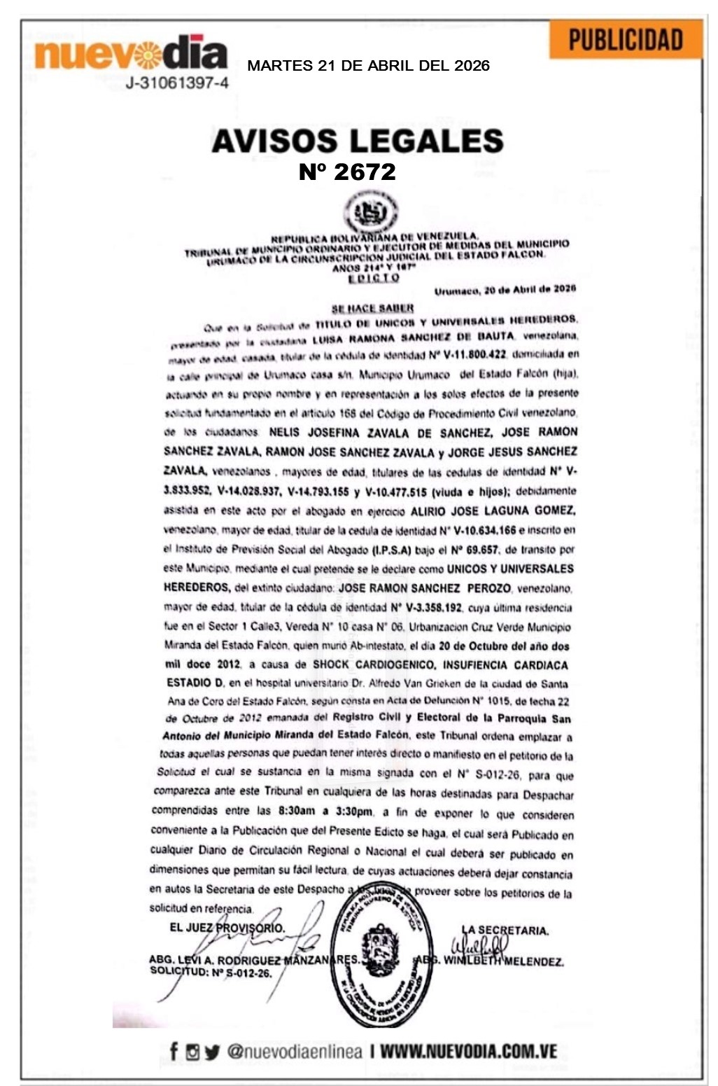 InicioPublicidadLegales PublicidadLegales Edicto.José Ramón Sánchez Perozo. 21/04/2026 FacebookTwitterPinterestWhatsApp 2672. 21-04-2026 Cuota FacebookTwitterPinterestWhatsApp Artículo anteriorTrump: «Irán ha violado el alto el fuego en numerosas ocasiones»Artículo siguienteCartel de Notificación.Inversiones R&M 2021.C.A. Mercadeo NuevoDia Noticias Relacionadas Legales Cartel de Notificación.Distribuidora El Novillo.C.A. Legales Cartel de Notificación.Grupo Policlínico María Auxiliadora.C.A. Legales Cartel de Notificación.Inversiones Hosana en las Alturas.C.A. Redes Sociales20,299FansMe gusta112,425SeguidoresSeguir4,600SuscriptoresSuscribirte Últimas noticias Destacadas Jorge Arreaza: María Corina no aplica para ser beneficiada por la Ley de Amnistía Destacadas Casi 20% de la carne que se consume en el país es de búfalo Cargar más