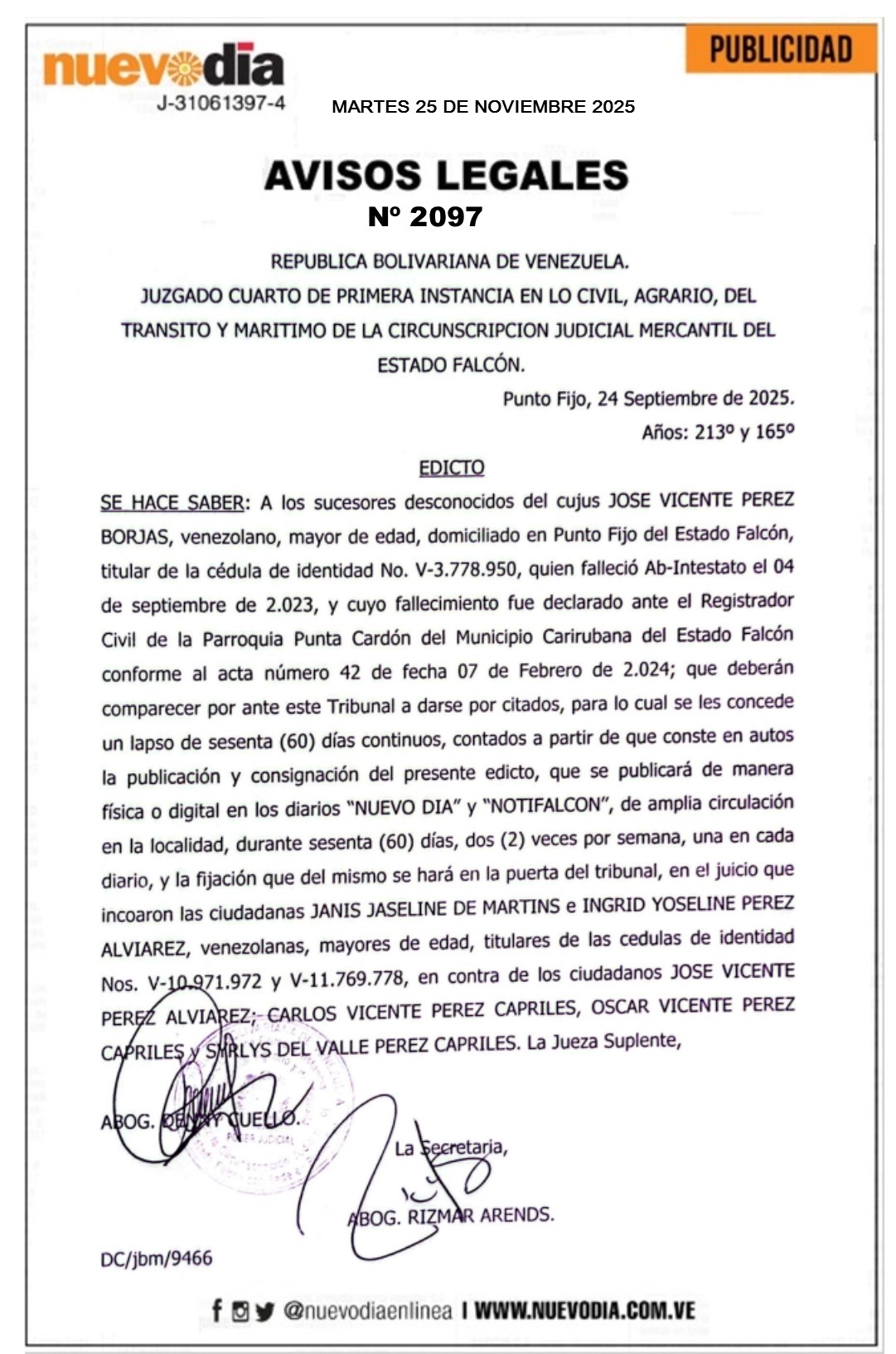 InicioPublicidadLegales PublicidadLegales Edicto.José Vicente Pérez Borjas. 25/11/2025 FacebookTwitterPinterestWhatsApp 2097. 25-11-2025 Cuota FacebookTwitterPinterestWhatsApp Artículo anteriorPortada martes 25 de noviembre de 2025Artículo siguienteEdicto.José Gregorio Loyo Leal. Mercadeo NuevoDia Noticias Relacionadas Legales Edicto.José Gregorio Loyo Leal. Legales Cartel de Notificación.Fundo Elizabeth.Jecci Elizabeth Pérez Giménez.Franklin Neptali Mora Castillo. Legales Cartel de Notificación.Hector José Lozano Lattronico. Redes Sociales20,299FansMe gusta112,425SeguidoresSeguir4,600SuscriptoresSuscribirte Últimas noticias Destacadas Pronóstico de lluvias fuertes para hoy 25-Nov en estos estados Destacadas Llegan 250 mil dosis de vacunas pentavalente a Venezuela Cargar más
