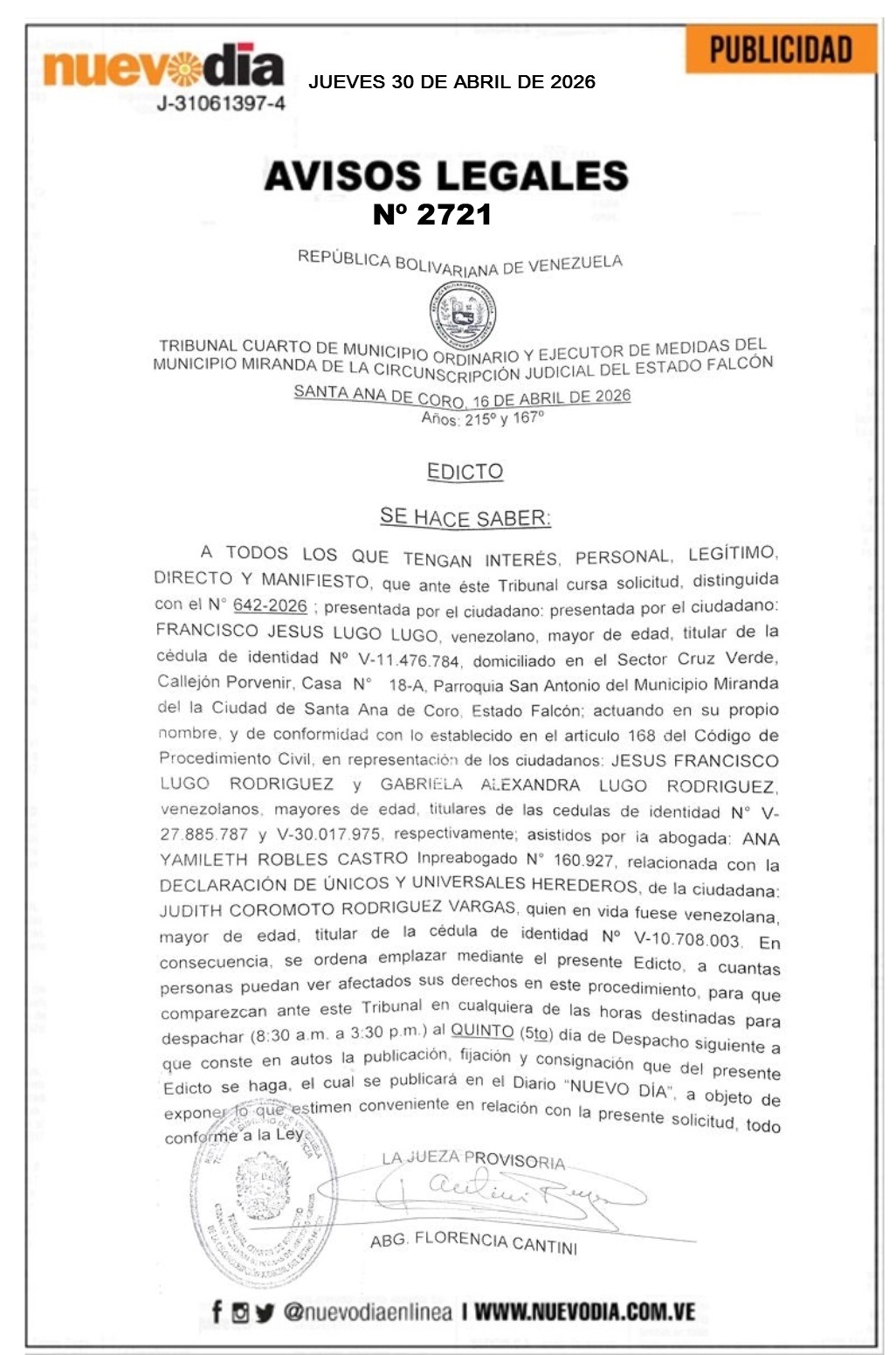 InicioPublicidadLegales PublicidadLegales Edicto.Judith Coromoto Rodríguez Vargas. 30/04/2026 FacebookTwitterPinterestWhatsApp 2721. 30-04-2026 Cuota FacebookTwitterPinterestWhatsApp Artículo anteriorEmiten alerta roja para sujeto que mató a su expareja y a su tíoArtículo siguienteAmerican Airlines retoma este 30-Abr vuelos directos Miami-Caracas Mercadeo NuevoDia Noticias Relacionadas Legales Cartel de Citación.Ana Margarita Gómez Bermúdez. Legales Cartel de Notificación.Daniel Antonio Cuba Loaiza. Legales Edicto.Ramona Antonia García. Redes Sociales20,299FansMe gusta112,425SeguidoresSeguir4,600SuscriptoresSuscribirte Últimas noticias Destacadas Delcy Rodríguez revela detalles sobre mejoras salariales en Venezuela Destacadas BP retoma proyectos de gas con Venezuela en la frontera con Trinidad y Tobago Cargar más