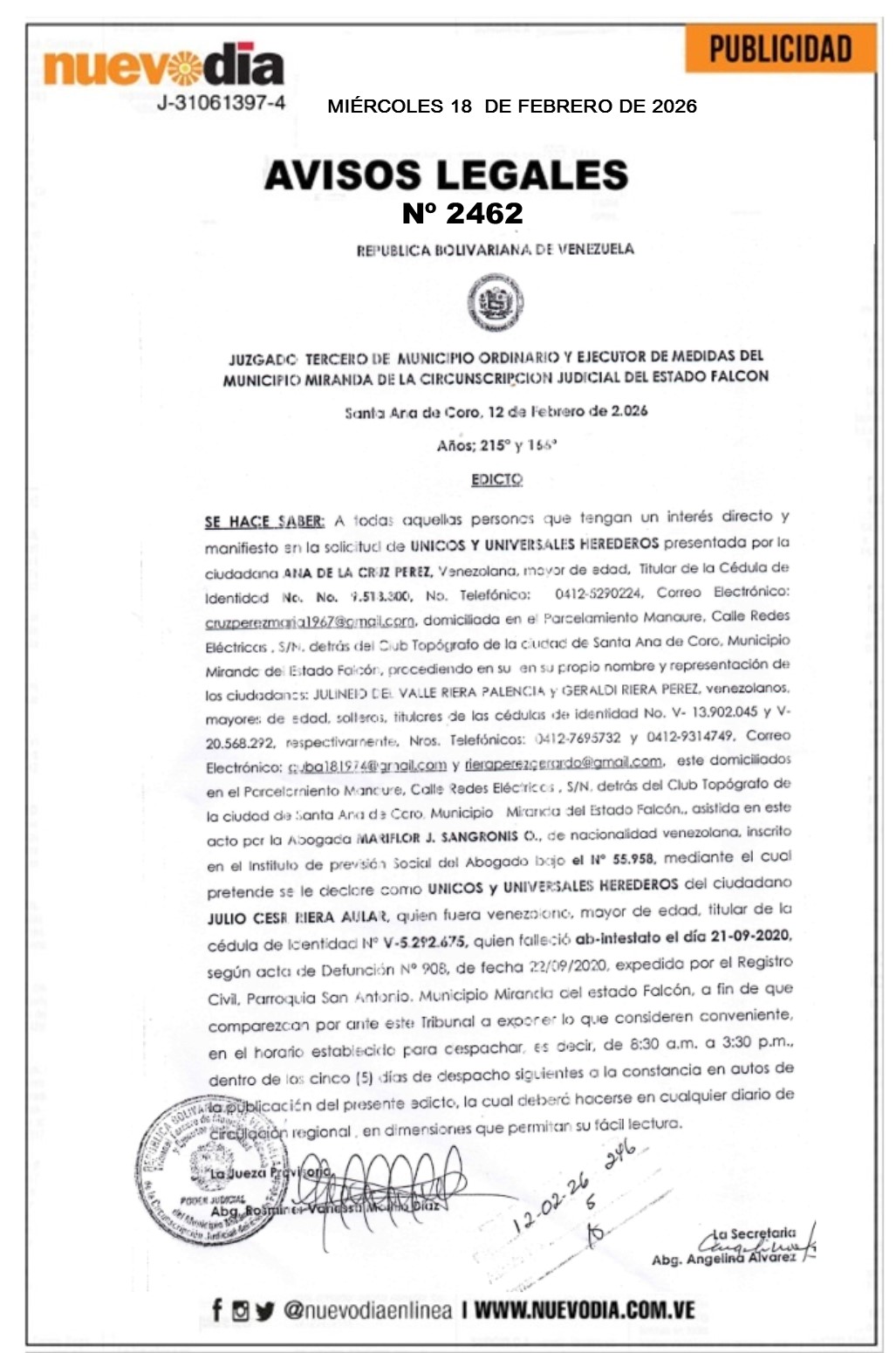 InicioPublicidadLegales PublicidadLegales Edicto.Julio César Riera Aular. 18/02/2026 FacebookTwitterPinterestWhatsApp 2462. 18-02-2026 Cuota FacebookTwitterPinterestWhatsApp Artículo anteriorEdicto.Leopoldo José Riera Aular.Artículo siguienteEdicto.Jesús Manuel Ravelo Abreu. Mercadeo NuevoDia Noticias Relacionadas Legales Edicto.Jesús Manuel Ravelo Abreu. Legales Edicto.Leopoldo José Riera Aular. Legales Cartel de Notificación.Epifania Esther Solano Hernández. Redes Sociales20,299FansMe gusta112,425SeguidoresSeguir4,600SuscriptoresSuscribirte Últimas noticias Destacadas Seis estados del país tendrán operativos del INTT desde el 18-Feb Destacadas Caracas estrena gasolina súper premium a un dólar por litro Cargar más