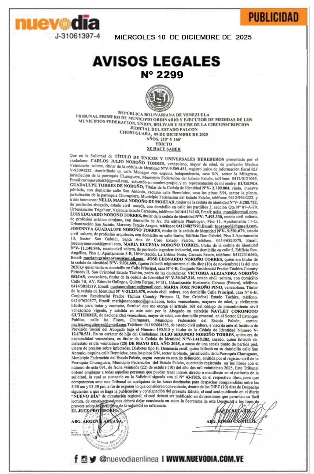 InicioPublicidadLegales PublicidadLegales Edicto.Julio Segundo Noroño Torres. 10/12/2025 FacebookTwitterPinterestWhatsApp 2299. 10-12-2025 Cuota FacebookTwitterPinterestWhatsApp Artículo anteriorPresidente Maduro ordena mesa de trabajo con sector privado y eléctricoArtículo siguienteAlto comisionado de la ONU pide desescalada entre Venezuela y EE.UU. Mercadeo NuevoDia Noticias Relacionadas Legales Cartel de Citación.Carlos Gouveia de Nobrega. Legales Edicto.Victor Manuel Alvarez Cossi. Legales Edicto.Antonio José Chirino Lugo y Jorge Federico Chirinos Lugo. Redes Sociales20,299FansMe gusta112,425SeguidoresSeguir4,600SuscriptoresSuscribirte Últimas noticias Sin categoria Arquidiócesis de Caracas y CEV se solidarizan con el cardenal Baltazar Porras Destacadas Delcy Rodríguez: «En Noruega asistieron a un velorio. El show fracasó» Cargar más