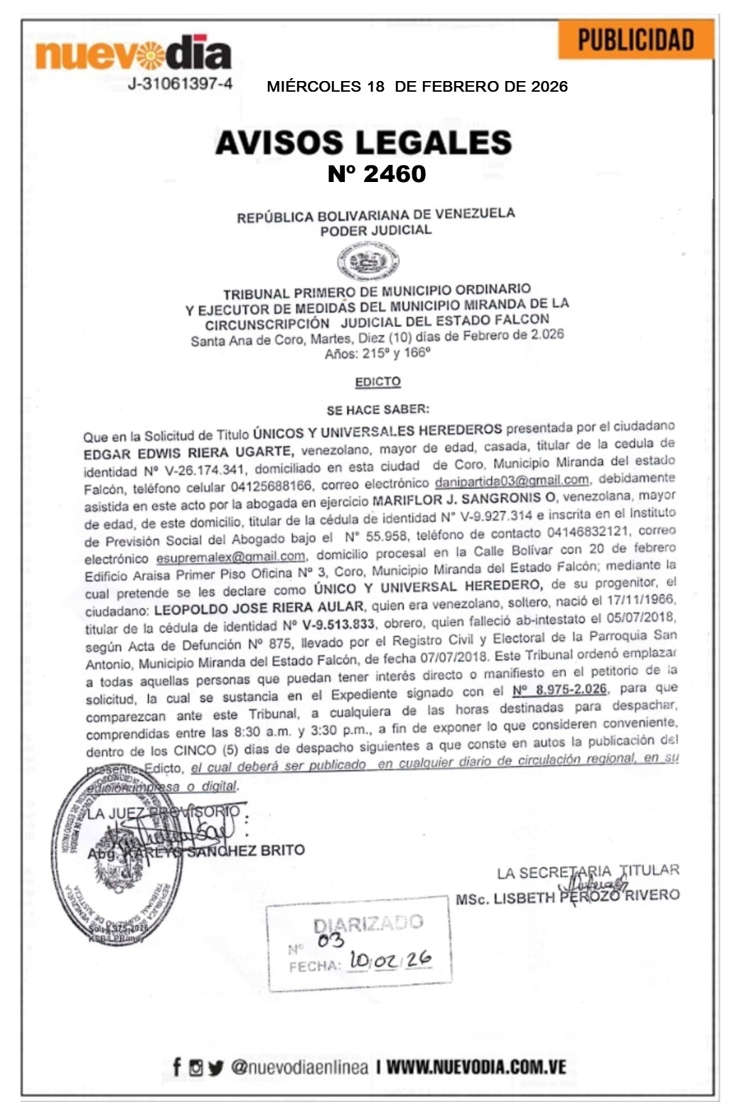 InicioPublicidadLegales PublicidadLegales Edicto.Leopoldo José Riera Aular. 18/02/2026 FacebookTwitterPinterestWhatsApp 2460. 18-02-2026 Cuota FacebookTwitterPinterestWhatsApp Artículo anteriorCartel de Notificación.Epifania Esther Solano Hernández.Artículo siguienteEdicto.Julio César Riera Aular. Mercadeo NuevoDia Noticias Relacionadas Legales Edicto.Jesús Manuel Ravelo Abreu. Legales Edicto.Julio César Riera Aular. Legales Cartel de Notificación.Epifania Esther Solano Hernández. Redes Sociales20,299FansMe gusta112,425SeguidoresSeguir4,600SuscriptoresSuscribirte Últimas noticias Destacadas Seis estados del país tendrán operativos del INTT desde el 18-Feb Destacadas Caracas estrena gasolina súper premium a un dólar por litro Cargar más