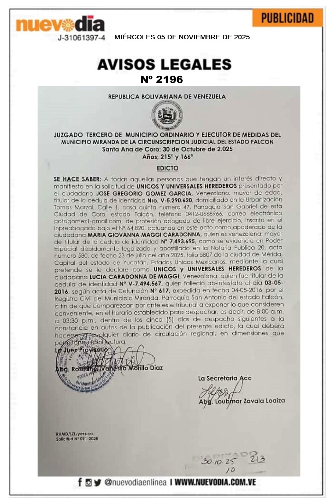 InicioPublicidadLegales PublicidadLegales Edicto.Lucia Caradonna de Maggi. 05/11/2025 FacebookTwitterPinterestWhatsApp 2196. 05-11-2025 Cuota FacebookTwitterPinterestWhatsApp Artículo anteriorDepurar gobernaciones y alcaldías, la nueva instrucción de MaduroArtículo siguienteLey de Convivencia y Paz Ciudadana estrena reforma Mercadeo NuevoDia Noticias Relacionadas Legales Cartel de Notificación.Comercializadora Damasco,C.A. Legales Convocatoria Asamblea General.Instituto Universitario de Tecnología José Leonardo Chirino(IUTJLCH). Legales Cartel de Notificación.Comercializadora Damasco,C.A. Redes Sociales20,299FansMe gusta112,425SeguidoresSeguir4,600SuscriptoresSuscribirte Últimas noticias Destacadas Venezuela busca acuerdo «arancel cero» con China para 400 productos Destacadas Depurar gobernaciones y alcaldías, la nueva instrucción de Maduro Cargar más