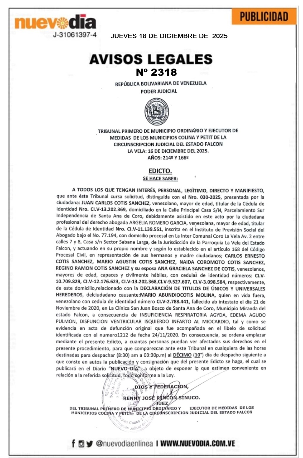 InicioPublicidadLegales PublicidadLegales Edicto.Mario Abundio Cotis Molina. 18/12/2025 FacebookTwitterPinterestWhatsApp 2318. 18-12-2025 Cuota FacebookTwitterPinterestWhatsApp Artículo anteriorGuterres pide moderación y desescalada inmediata en el CaribeArtículo siguienteConsejo Europeo impone sanciones a otros 41 buques rusos Mercadeo NuevoDia Noticias Relacionadas Legales Edicto.José Angel García. Legales Edicto.Morella Ramírez de Lanz. Legales Edicto.Miguel Segundo Nava. Redes Sociales20,299FansMe gusta112,425SeguidoresSeguir4,600SuscriptoresSuscribirte Últimas noticias Destacadas Cabello: MCM planea ataques a embajadas en Venezuela Destacadas Este es el llamado de Maduro a los militares colombianos Cargar más