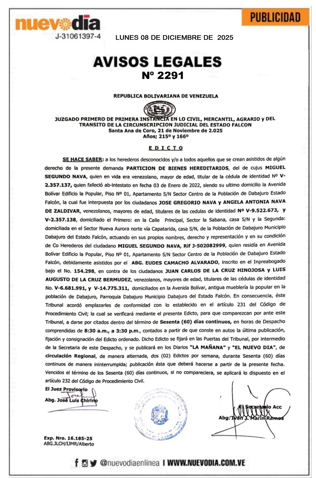 InicioSin categoria Sin categoria Edicto.Miguel Segundo Nava. 08/12/2025 FacebookTwitterPinterestWhatsApp 2291. 08-12-2025 Cuota FacebookTwitterPinterestWhatsApp Artículo anteriorEdicto.Alexis Ramón Sánchez Calatayud. Mercadeo NuevoDia Noticias Relacionadas Sin categoria Edicto.Antonio José Chirino Lugo y Jorge Federico Chirinos Lugo. Sin categoria Edicto.Anthony Molinary Martos. Sin categoria Alcaldía y el Concejo municipal reconocieron labor de músicos de Colina Redes Sociales20,299FansMe gusta112,425SeguidoresSeguir4,600SuscriptoresSuscribirte Últimas noticias Destacadas 8-Dic | Así arranca el precio del dólar, hoy es feriado bancario Destacadas Maduro ratifica continuidad del Plan Vuelta a la Patria Cargar más