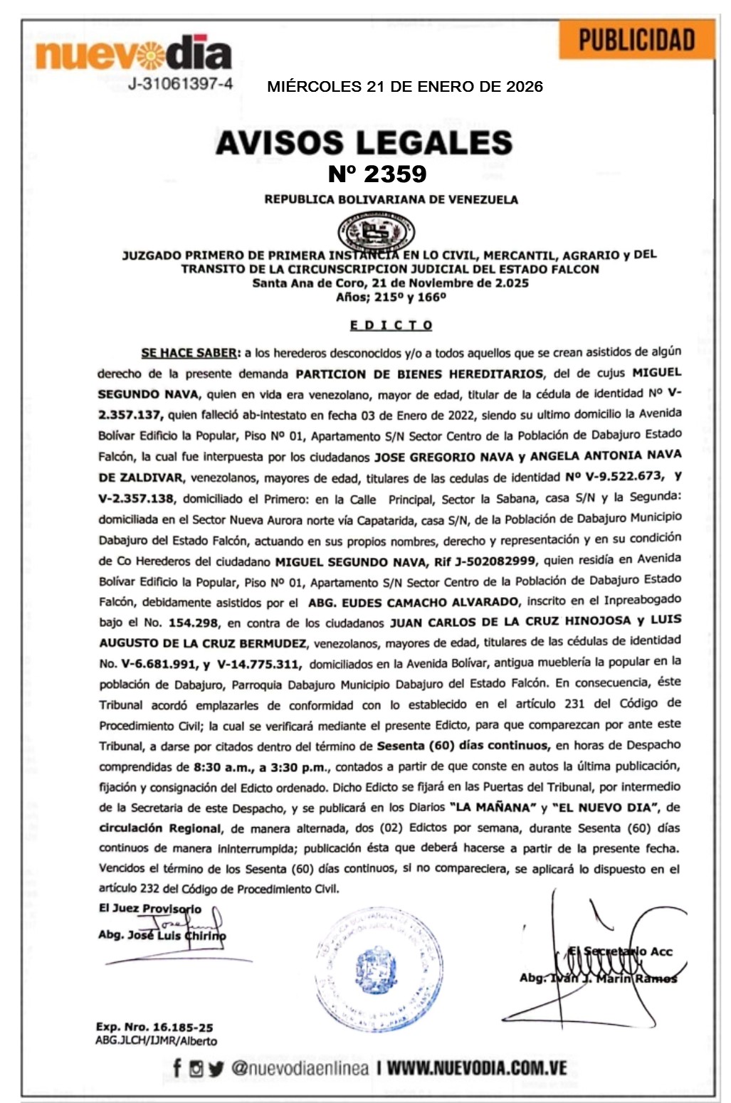 InicioPublicidadLegales PublicidadLegales Edicto.Miguel Segundo Nava. 21/01/2026 FacebookTwitterPinterestWhatsApp 2359. 21-01-2026 Cuota FacebookTwitterPinterestWhatsApp Artículo anteriorPolicía en Boca de Aroa detuvo a hombre con un facsimil de arma de fuegoArtículo siguientePreparativos de seguridad para un Carnaval Seguro 2026 Mercadeo NuevoDia Noticias Relacionadas Legales Edicto.Secundino Gregorio Reyes Guerrero. Legales Edicto.Gladys Guadalupe Barrios D Vargas. Legales Edicto.Antonio José Chirino Lugo y Jorge Federico Chirinos Lugo. Redes Sociales20,299FansMe gusta112,425SeguidoresSeguir4,600SuscriptoresSuscribirte Últimas noticias Destacadas Precio del dólar oficial subió 0,80 %, así se cotiza hoy 21-Ene Destacadas Jorge Rodríguez: es necesario avanzar hacia un nuevo Código Electoral Cargar más