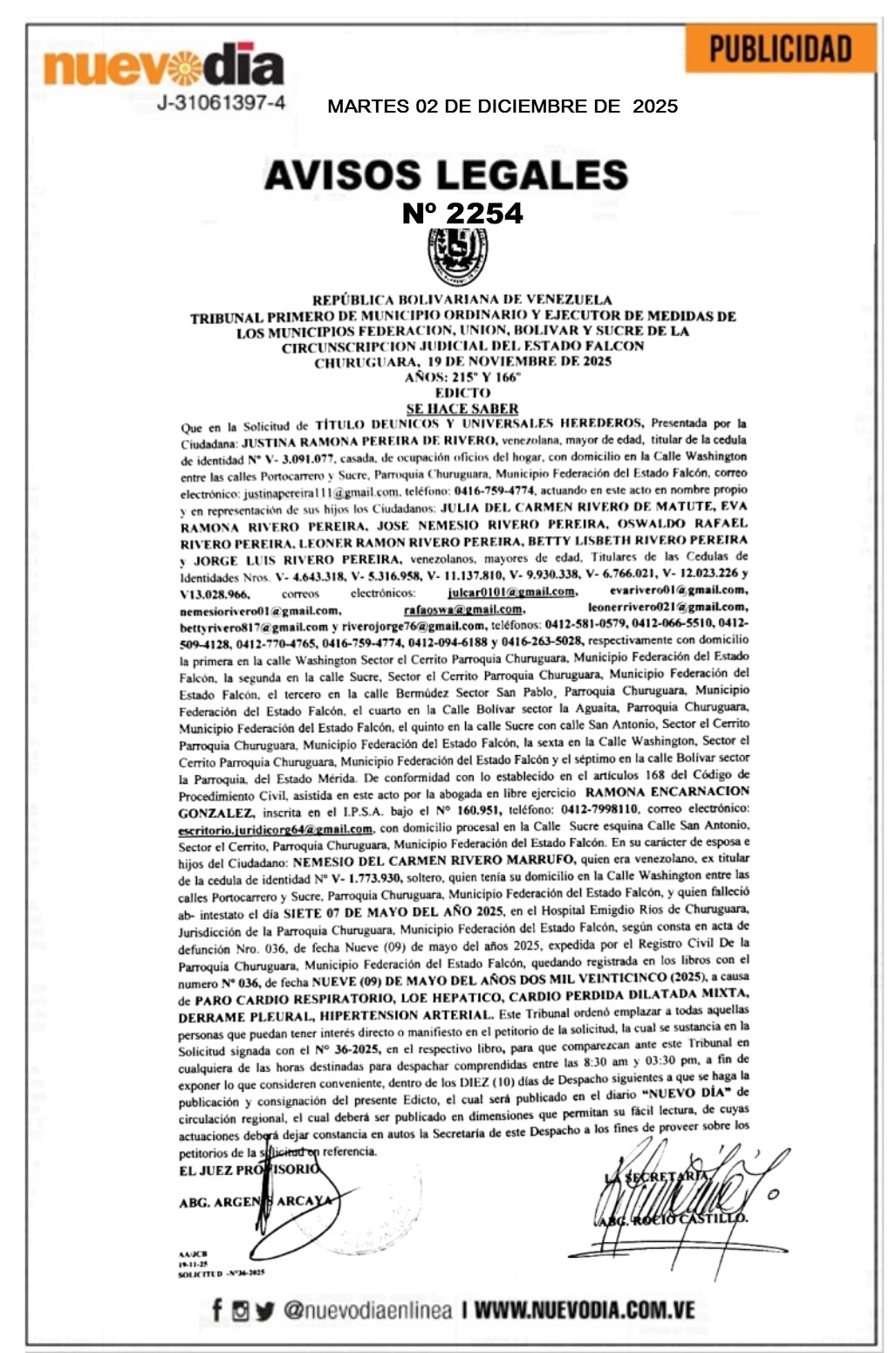 InicioPublicidadLegales PublicidadLegales Edicto.Nemesio del Carmen Rivero Marrufo. 02/12/2025 FacebookTwitterPinterestWhatsApp 2254. 02-12-2025 Cuota FacebookTwitterPinterestWhatsApp Artículo anteriorEdicto.José Gregorio Loyo Leal. Mercadeo NuevoDia Noticias Relacionadas Legales Edicto.José Gregorio Loyo Leal. Legales Edicto.José Vicente Pérez Borjas. Legales Cartel de Notificación.Juán David Restrepo Angel. Redes Sociales20,299FansMe gusta112,425SeguidoresSeguir4,600SuscriptoresSuscribirte Últimas noticias Destacadas Inac restringe vuelos civiles en espacio aéreo cercano a frontera sur de Venezuela Destacadas Nuevas tarifas en peajes de Venezuela desde hoy 1-Dic +MONTOS Cargar más