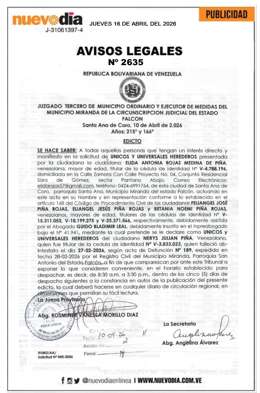 InicioPublicidadLegales PublicidadLegales Edicto.Nerys Julian Piña. 16/04/2026 FacebookTwitterPinterestWhatsApp 2635. 16-04-2026 Cuota FacebookTwitterPinterestWhatsApp Artículo anteriorLeón XIV desde Camerún: «El mundo está siendo destruido por unos pocos tiranos»Artículo siguienteInauguran Occidental de Natación con participación de nueve estados en Falcón Mercadeo NuevoDia Noticias Relacionadas Legales Notificación.Orlando Anibal Alvarez Arias. Legales Convocatoria.Accionistas A y B.Asamblea Ordinaria de Socios.Clínica Virgen de Guadalupe. Legales Cartel de Citación.Ana Margarita Gómez Bermúdez. Redes Sociales20,299FansMe gusta112,425SeguidoresSeguir4,600SuscriptoresSuscribirte Últimas noticias Destacadas Fedecámaras valora como positiva la licencia otorgada al BCV Destacadas Venezuela y la UE reactivan agenda de alto nivel Cargar más