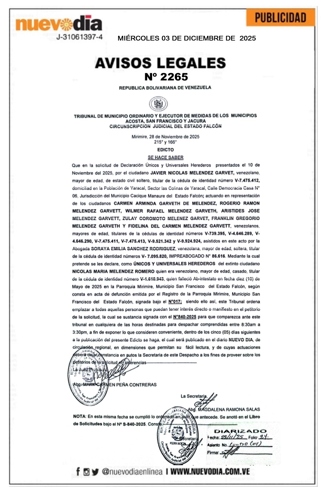 InicioPublicidadLegales PublicidadLegales Edicto.Nicolas María Meléndez Romero. 03/12/2025 FacebookTwitterPinterestWhatsApp 2265. 03-12-2025 Cuota FacebookTwitterPinterestWhatsApp Artículo anteriorA tiros asesinan a venezolana en Perú, llegaba a su casa +VIDEOArtículo siguienteNiños de Educación Inicial arranca mes de diciembre con parrandón Mercadeo NuevoDia Noticias Relacionadas Legales Cartel de Notificación.Miguel Jesús Salón Vargas. Legales Edicto.Higinio de Jesús Castro Castro. Legales Convocatoria.Asamblea Extraordinaria de Accionistas.Serenos Montalban.C.A. Redes Sociales20,299FansMe gusta112,425SeguidoresSeguir4,600SuscriptoresSuscribirte Últimas noticias Destacadas AN repudia despojo de Citgo por parte de EE. UU. Destacadas Este es el precio del dólar hoy 3-Dic Cargar más