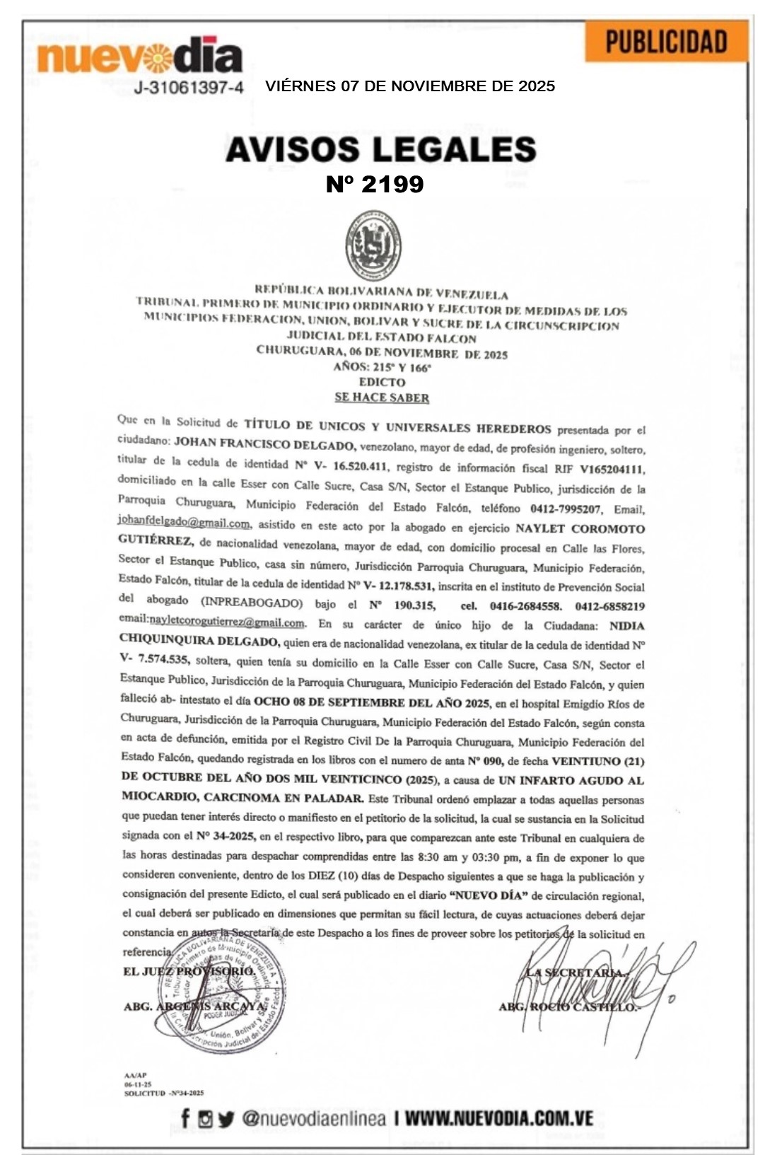 InicioPublicidadLegales PublicidadLegales Edicto.Nidia Chiquinquira Delgado. 07/11/2025 FacebookTwitterPinterestWhatsApp 2199. 07-11-2025 Cuota FacebookTwitterPinterestWhatsApp Artículo anteriorDavid Peralta juega su última temporada en la LVBPArtículo siguienteCorte Suprema discutirá posible revocación del matrimonio igualitario en EE. UU. Mercadeo NuevoDia Noticias Relacionadas Legales Edicto.Flora Beatriz Loyo de Toyo, José Angel Toyo Acosta, José Antonio Toyo Loyo, Jésus Israel Toyo Loyo, Yoel Rafael Toyo Loyo, Henry Gregorio Toyo... Legales Edicto.Elida Rosa Rodríguez de Penso. Legales Cartel de Notificación.Efrain José Fernández Lugo. Redes Sociales20,299FansMe gusta112,425SeguidoresSeguir4,600SuscriptoresSuscribirte Últimas noticias Destacadas Así está el precio del dólar en Venezuela hoy 7-Nov Destacadas Venezuela participa en la COP30 de Brasil (+FOTOS) Cargar más