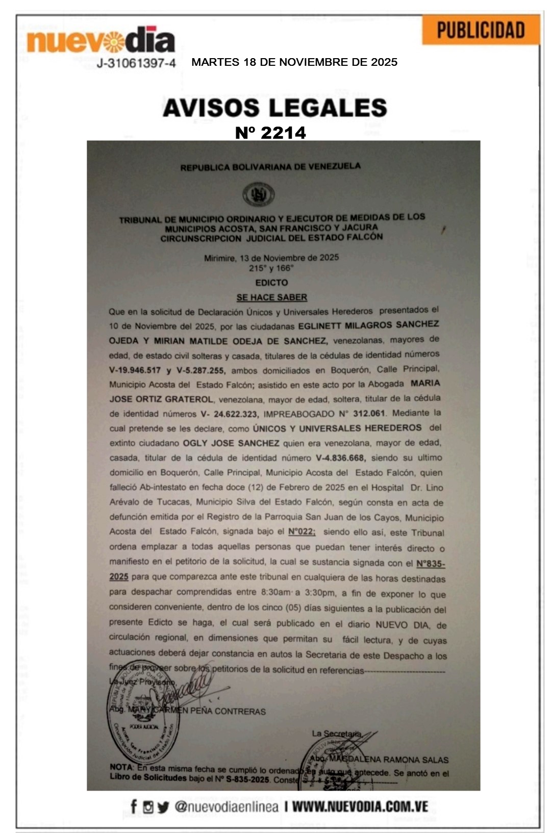 InicioPublicidadLegales PublicidadLegales Edicto.Ogly José Sánchez. 18/11/2025 FacebookTwitterPinterestWhatsApp 2214. 18-11-2025 Cuota FacebookTwitterPinterestWhatsApp Artículo anteriorEE. UU. designará al Cartel de los Soles como «organización terrorista extranjera»Artículo siguienteEdicto.José Vicente Pérez Borjas. Mercadeo NuevoDia Noticias Relacionadas Legales Edicto.José Gregorio Loyo Leal. Legales Edicto.José Vicente Pérez Borjas. Legales Cartel de Notificación.Rogelio José Escalona. Redes Sociales20,299FansMe gusta112,425SeguidoresSeguir4,600SuscriptoresSuscribirte Últimas noticias Destacadas Cabello: «Nuestro pueblo no se intimida y sabe lo que tiene que hacer» Destacadas Más de un millón de vacunas llegan a Venezuela provenientes de La India Cargar más