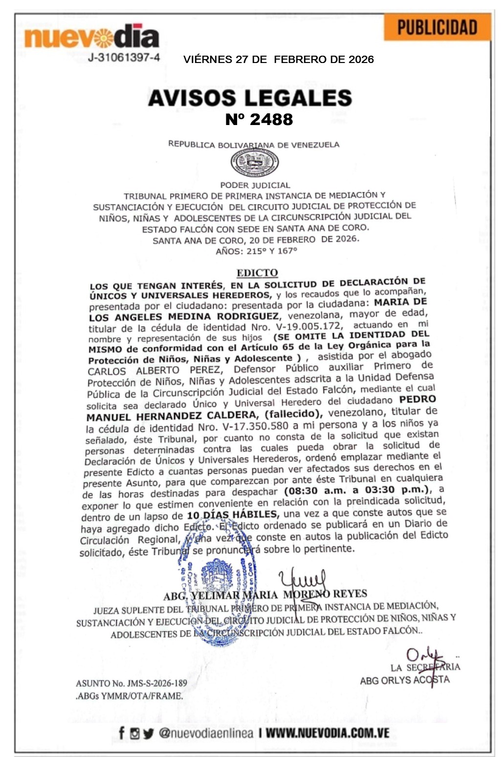 InicioPublicidadLegales PublicidadLegales Edicto.Pedro Manuel Hernández Caldera. 27/02/2026 FacebookTwitterPinterestWhatsApp 2488. 27-02-2026 Cuota FacebookTwitterPinterestWhatsApp Artículo anteriorEdicto.Francisco D’sales Sandoval Rodríguez.Artículo siguienteAsí amanece el precio del dólar en Venezuela hoy 27-Feb Mercadeo NuevoDia Noticias Relacionadas Legales Edicto.Francisco D’sales Sandoval Rodríguez. Legales Edicto.Edgar José Leal. Legales Edicto.Edgar Salvador Morillo. Redes Sociales20,299FansMe gusta112,425SeguidoresSeguir4,600SuscriptoresSuscribirte Últimas noticias Destacadas Así amanece el precio del dólar en Venezuela hoy 27-Feb Destacadas El 58 % de los venezolanos espera mejoras económicas en los próximos 6 meses Cargar más