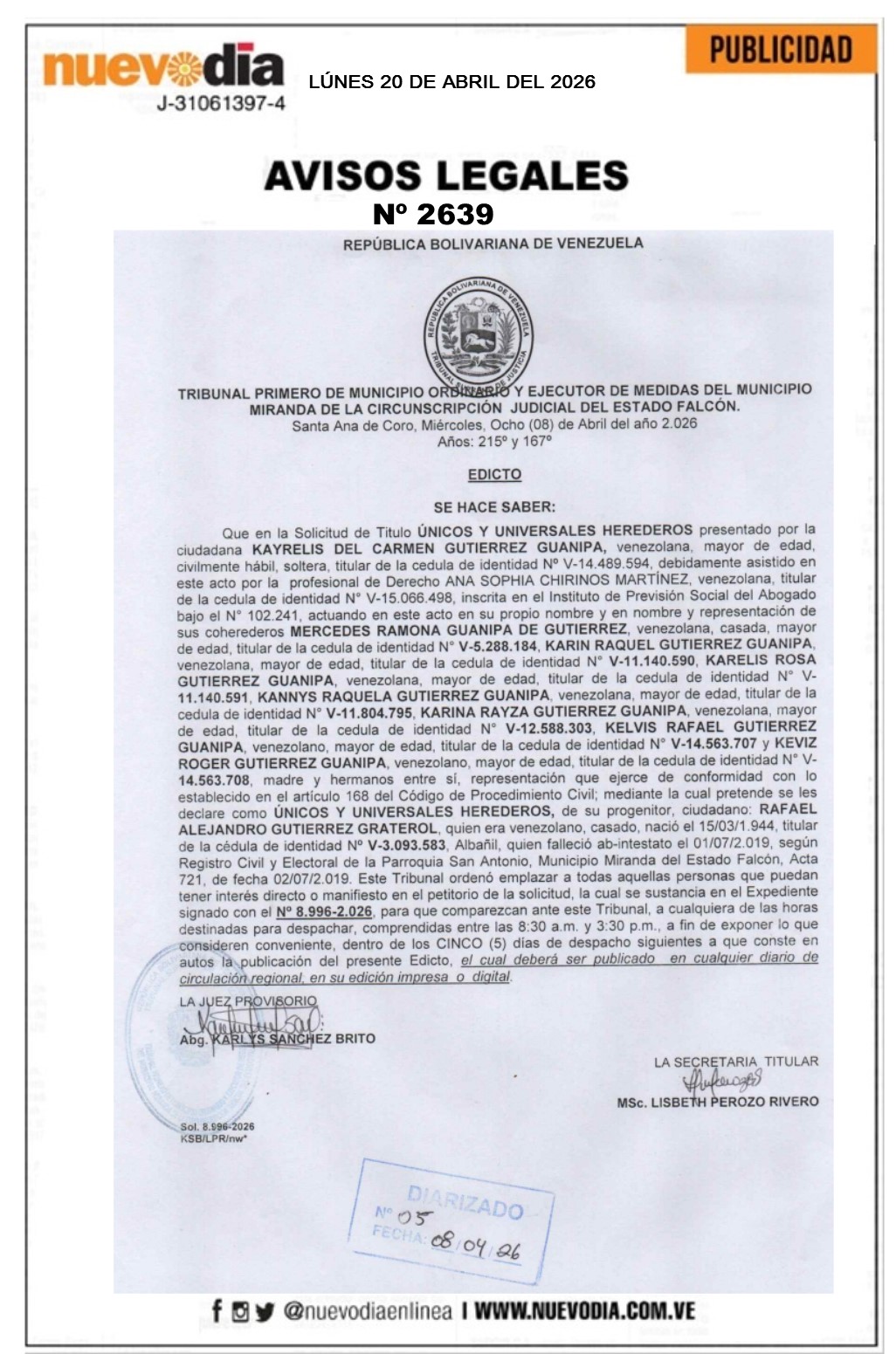 InicioPublicidadLegales PublicidadLegales Edicto.Rafael Alejandro Gutiérrez Graterol. 20/04/2026 FacebookTwitterPinterestWhatsApp 2639. 20-04-2026 Cuota FacebookTwitterPinterestWhatsApp Artículo anteriorTsunami provocado por terremoto en Japón no afectará la costa de ChinaArtículo siguienteJD Vance viaja a Islamabad para negociar con Irán, pese a rechazo de Teherán Mercadeo NuevoDia Noticias Relacionadas Legales Cartel de Notificación.Jorge Armando Garizao Mujica. Legales Tercera Convocatoria.Asamblea Extraordinaria de Propietarios Condominio del Complejo Caribbean Marina & Beach Club. Legales Cartel de Citación.Marbella Guadalupe De Sousa Dávila. Redes Sociales20,299FansMe gusta112,425SeguidoresSeguir4,600SuscriptoresSuscribirte Últimas noticias Destacadas Cabello critica insultos contra Delcy Rodríguez, esto dijo Destacadas Presidente de Asobanca no ve conveniente dolarizar la economía Cargar más