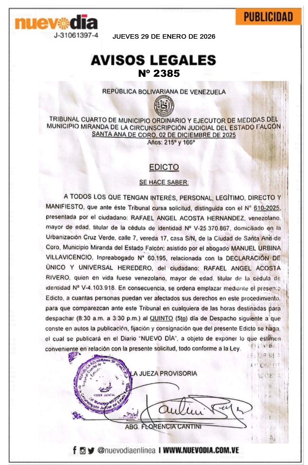 InicioPublicidadLegales PublicidadLegales Edicto.Rafael Angel Acosta Rivero. 29/01/2026 FacebookTwitterPinterestWhatsApp 2385. 29-01-2025 Cuota FacebookTwitterPinterestWhatsApp Artículo anteriorAlbares reafirma el apoyo de España a un diálogo pacífico en VenezuelaArtículo siguienteChevron proyecta subir a 300.000 bpd sus envíos desde Venezuela Mercadeo NuevoDia Noticias Relacionadas Legales Edicto.Miguel Segundo Nava. Legales Cartel de Citación.Maritza Guadalupe Lugo Flores. Legales Edicto.Virgilio José Osteicochea Martínez, Yaritza Osteicochea Petit y José Virgilio Osteicochea Petit. Redes Sociales20,299FansMe gusta112,425SeguidoresSeguir4,600SuscriptoresSuscribirte Últimas noticias Destacadas Crearán Oficina Nacional para la Defensa y Seguridad Cibernética de Venezuela Destacadas Chevron proyecta subir a 300.000 bpd sus envíos desde Venezuela Cargar más