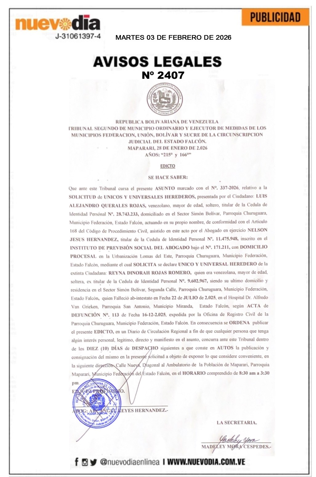 InicioPublicidadLegales PublicidadLegales Edicto.Reyna Dinorah Rojas Romero. 03/02/2026 FacebookTwitterPinterestWhatsApp 2407. 03-02-2026 Cuota FacebookTwitterPinterestWhatsApp Artículo anteriorCartel de Citación.Maritza Guadalupe Lugo Flores.Artículo siguienteRepública Dominicana y Venezuela restablecen conexión aérea Mercadeo NuevoDia Noticias Relacionadas Legales Acta Asamblea Extraordinaria.Centro Odontológico Salud Dent.C.A. Legales Cartel de Citación.Maritza Guadalupe Lugo Flores. Legales Convocatoria.Accionistas de la Sociedad Mercantil «Cliver Barber Shop».C.A. Redes Sociales20,299FansMe gusta112,425SeguidoresSeguir4,600SuscriptoresSuscribirte Últimas noticias Destacadas Laura Dogu: trabajaré «mano a mano» con los venezolanos Destacadas Precio del dólar oficial subió 0,50 %, así se cotiza hoy 3-Feb Cargar más