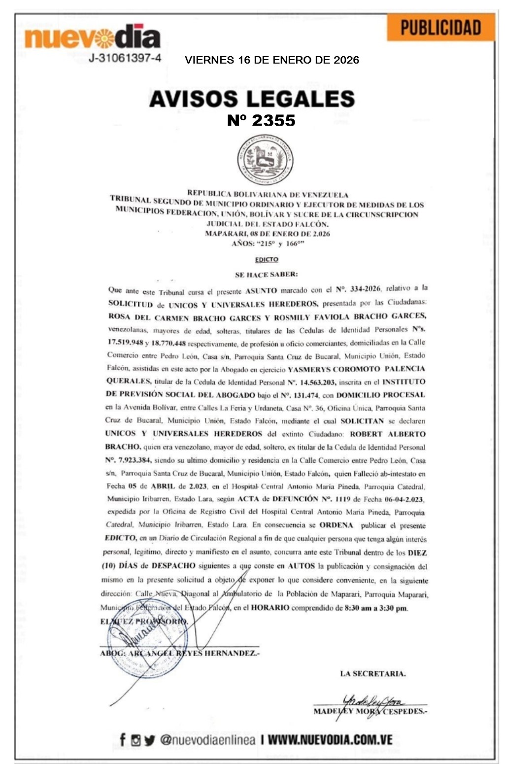 InicioPublicidadLegales PublicidadLegales Edicto.Robert Alberto Bracho. 16/01/2026 FacebookTwitterPinterestWhatsApp 2355. 16-01-2026 Cuota FacebookTwitterPinterestWhatsApp Artículo anteriorLa Uptag en el top 7 de las universidades politécnicas del paísArtículo siguienteJoven celoso incendió la vivienda de su exnovia, murió un septuagenario Mercadeo NuevoDia Noticias Relacionadas Legales Edicto.Antonio José Chirino Lugo y Jorge Federico Chirinos Lugo. Legales Edicto.Maria Antonia Granadillo de Pulgar. Legales Acta Constitutiva.Tumascota.PF.de Ydais de Labrador.F.P. Redes Sociales20,299FansMe gusta112,425SeguidoresSeguir4,600SuscriptoresSuscribirte Últimas noticias Destacadas Lunes bancario | Así abre el precio del dólar esta semana Destacadas Delcy Rodríguez realiza cambios en el gabinete ministerial Cargar más