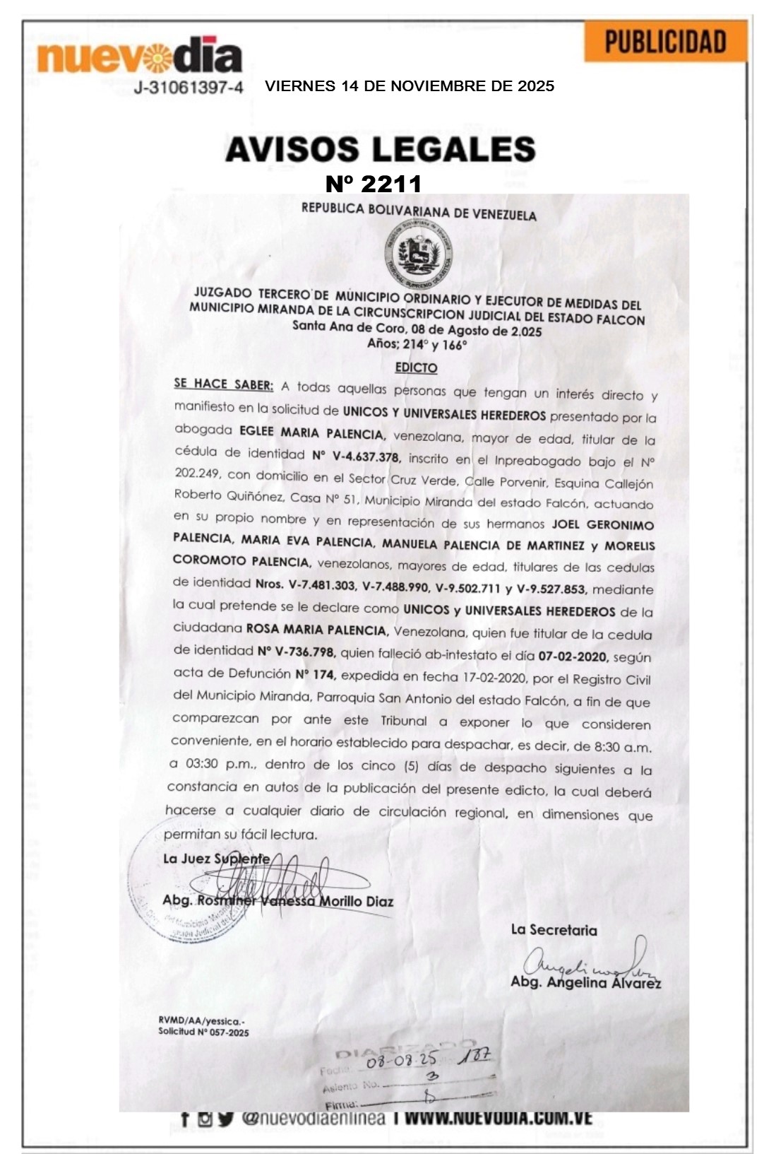 InicioPublicidadLegales PublicidadLegales Edicto.Rosa María Palencia. 14/11/2025 FacebookTwitterPinterestWhatsApp 2211. 14-11-2025 Cuota FacebookTwitterPinterestWhatsApp Artículo anteriorDos bonos de Patria comienzan a «caer» hoy 14-Nov +MONTOSArtículo siguienteCICPC investiga homicidio de hombre transgénero +DETALLES Mercadeo NuevoDia Noticias Relacionadas Legales Edicto.Flora Beatriz Loyo de Toyo, José Angel Toyo Acosta, José Antonio Toyo Loyo, Jésus Israel Toyo Loyo, Yoel Rafael Toyo Loyo, Henry Gregorio Toyo... Legales Edicto.Morella Ramírez de Lanz. Legales Edicto.Elida Rosa Rodríguez de Penso. Redes Sociales20,299FansMe gusta112,425SeguidoresSeguir4,600SuscriptoresSuscribirte Últimas noticias Destacadas Maduro: Sobre Venezuela hay una amenaza de invasión desde EE.UU. Destacadas Plan Independencia 200 | FANB mantiene despliegue permanente Cargar más