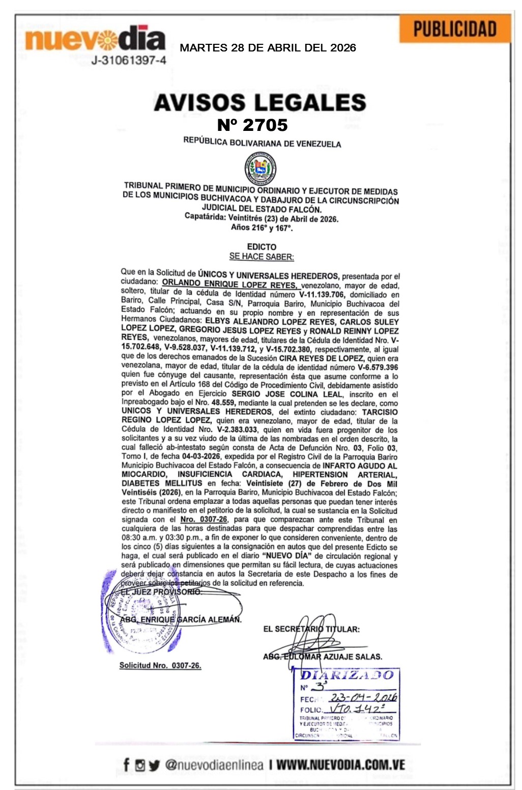 InicioPublicidadLegales PublicidadLegales Edicto.Tarcisio Regino López López. 28/04/2026 FacebookTwitterPinterestWhatsApp 2705. 28-04-2026 Cuota FacebookTwitterPinterestWhatsApp Artículo anteriorProyecciones de Luis Vicente León sobre el ajuste salarial responsableArtículo siguienteDelcy Rodríguez afirma que el primero de mayo «habrá mejoras salariales» Mercadeo NuevoDia Noticias Relacionadas Legales Cartel de Citación.Servicios y Mantenimientos Sacuragua.C.A. Legales Aviso Público.Sociedad Mercantil DARWIMAR.C.A. Legales Cartel de Notificación.Rectificación de Acta de Nacimiento.Yosmaira Milagros Montero Quevedo. Redes Sociales20,299FansMe gusta112,425SeguidoresSeguir4,600SuscriptoresSuscribirte Últimas noticias Destacadas Delcy Rodríguez afirma que el primero de mayo «habrá mejoras salariales» Destacadas Proyecciones de Luis Vicente León sobre el ajuste salarial responsable Cargar más