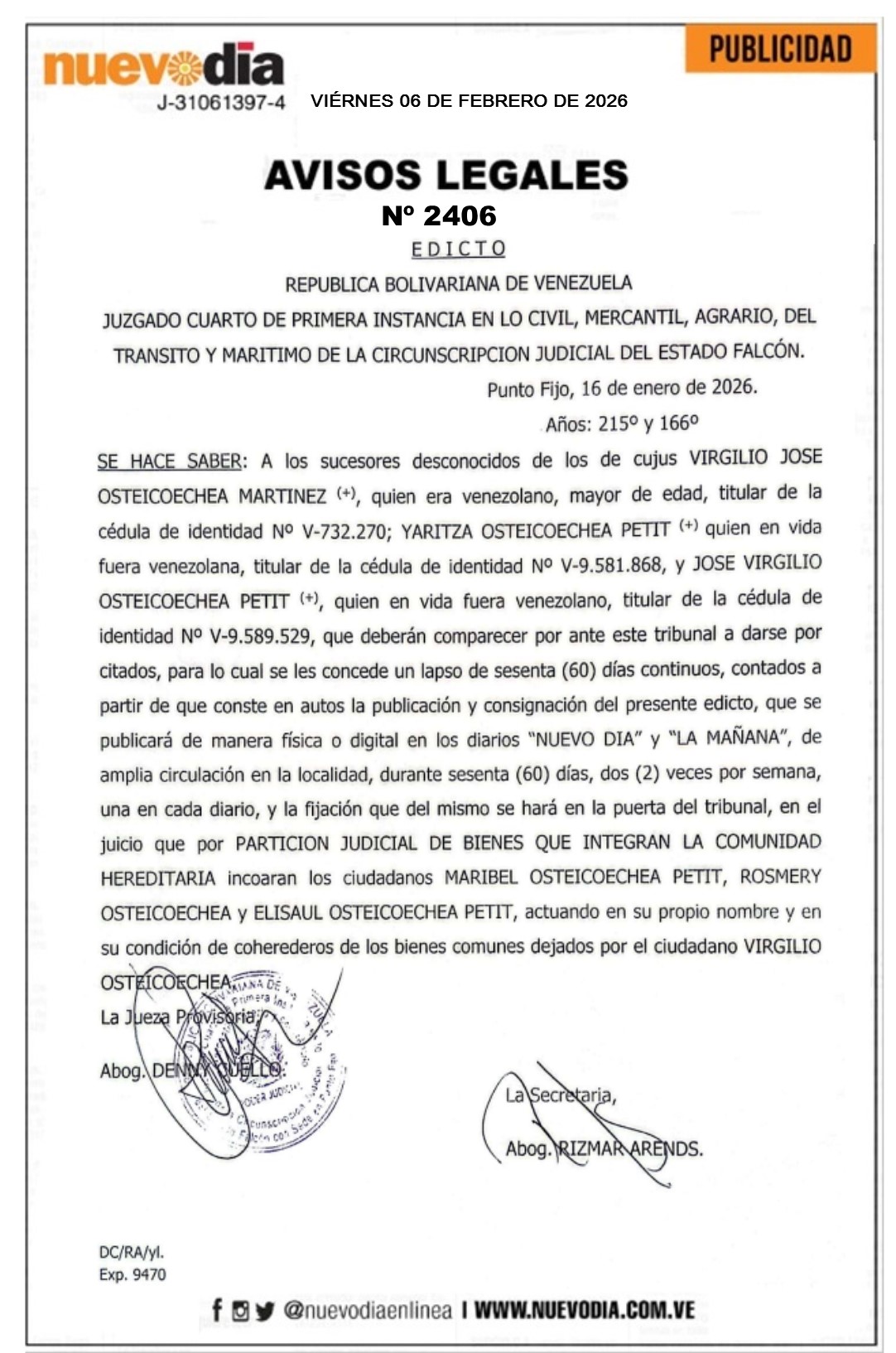 InicioPublicidadLegales PublicidadLegales Edicto.Virgilio José Osteicochea Martínez, Yaritza Osteicochea Petit y José Virgilio Osteicochea Petit. 06/02/2026 FacebookTwitterPinterestWhatsApp 2406. 06-02-2026 Cuota FacebookTwitterPinterestWhatsApp Artículo anteriorEdicto.Francisco D’Sales Sandoval Rodríguez.Artículo siguienteSerie de las Américas | Panamá remontó y derrotó a Venezuela Mercadeo NuevoDia Noticias Relacionadas Legales Edicto.Francisco D’Sales Sandoval Rodríguez. Legales Cartel de Notificación.Procesadora y Distribuidora Medina González.C.A. Legales Cartel de Notificación.Marbiel Antonio Toyo Hernández(Inversiones M.M. de Marbiel Toyo Hernández). Redes Sociales20,299FansMe gusta112,425SeguidoresSeguir4,600SuscriptoresSuscribirte Últimas noticias Destacadas 6-Feb | En ascenso precio del dólar en Venezuela Destacadas Ley de Amnistía | Jorge Rodríguez: Nosotros pedimos perdón +VIDEO Cargar más