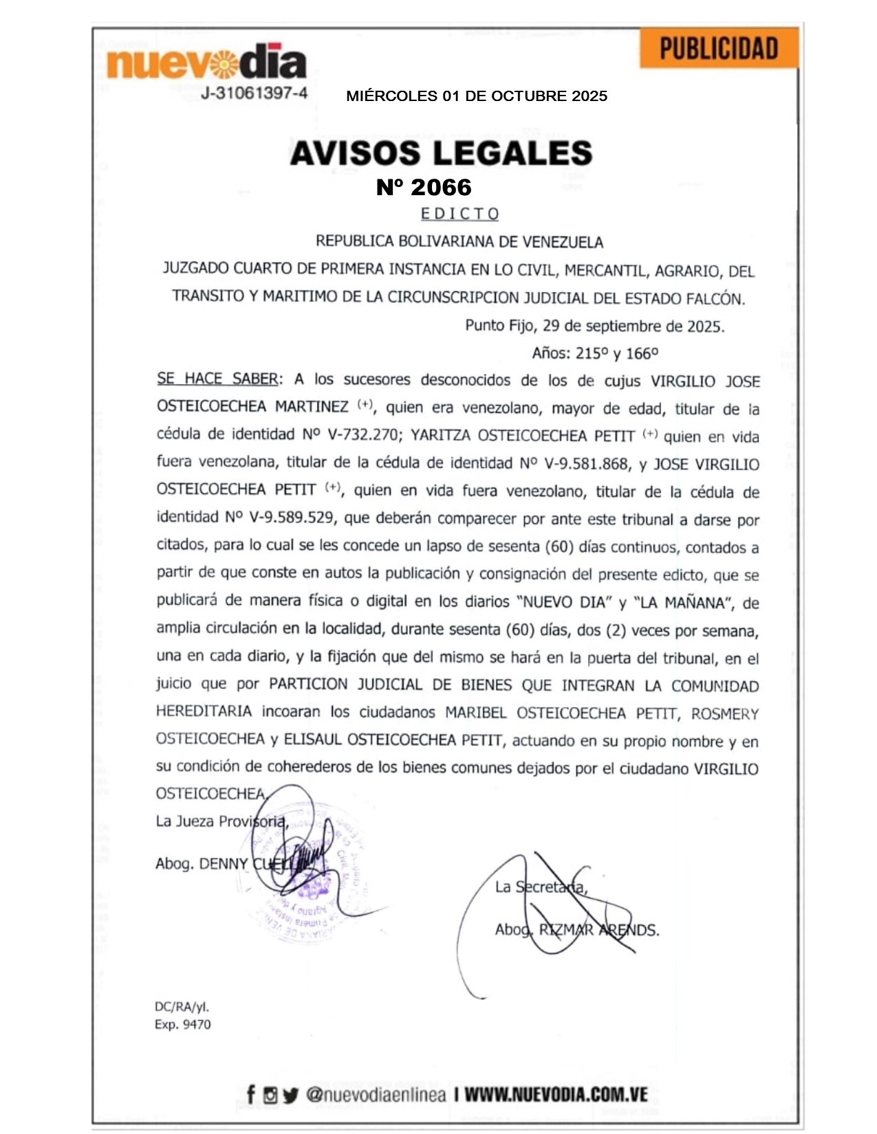 InicioPublicidadLegales PublicidadLegales Edicto.Virgilio José Osteicochea Martínez,Yaritza Osteicochea Petit y José Virgilio Osteicochea Petit. 01/10/2025 FacebookTwitterPinterestWhatsApp 2066. 01-10-2025 Cuota FacebookTwitterPinterestWhatsApp Artículo anteriorDebate sobre las tareas escolares en Venezuela inició este 1-OctArtículo siguientePortada jueves 02 de octubre de 2025 Mercadeo NuevoDia Noticias Relacionadas Legales Cartel de Notificación.Automercado Virgen del Carmen, C.A. Legales Cartel de Notificación.Samor,C.A. Legales Cartel de Notificación.Agrototal 2019,C.A. Redes Sociales20,299FansMe gusta112,425SeguidoresSeguir4,600SuscriptoresSuscribirte Últimas noticias Destacadas PDVSA factura $ 11.700 millones en nueve meses por exportaciones petroleras Destacadas Trasladan fiesta de los santos a parroquias por gran cantidad de fieles (COMUNICADO) Cargar más
