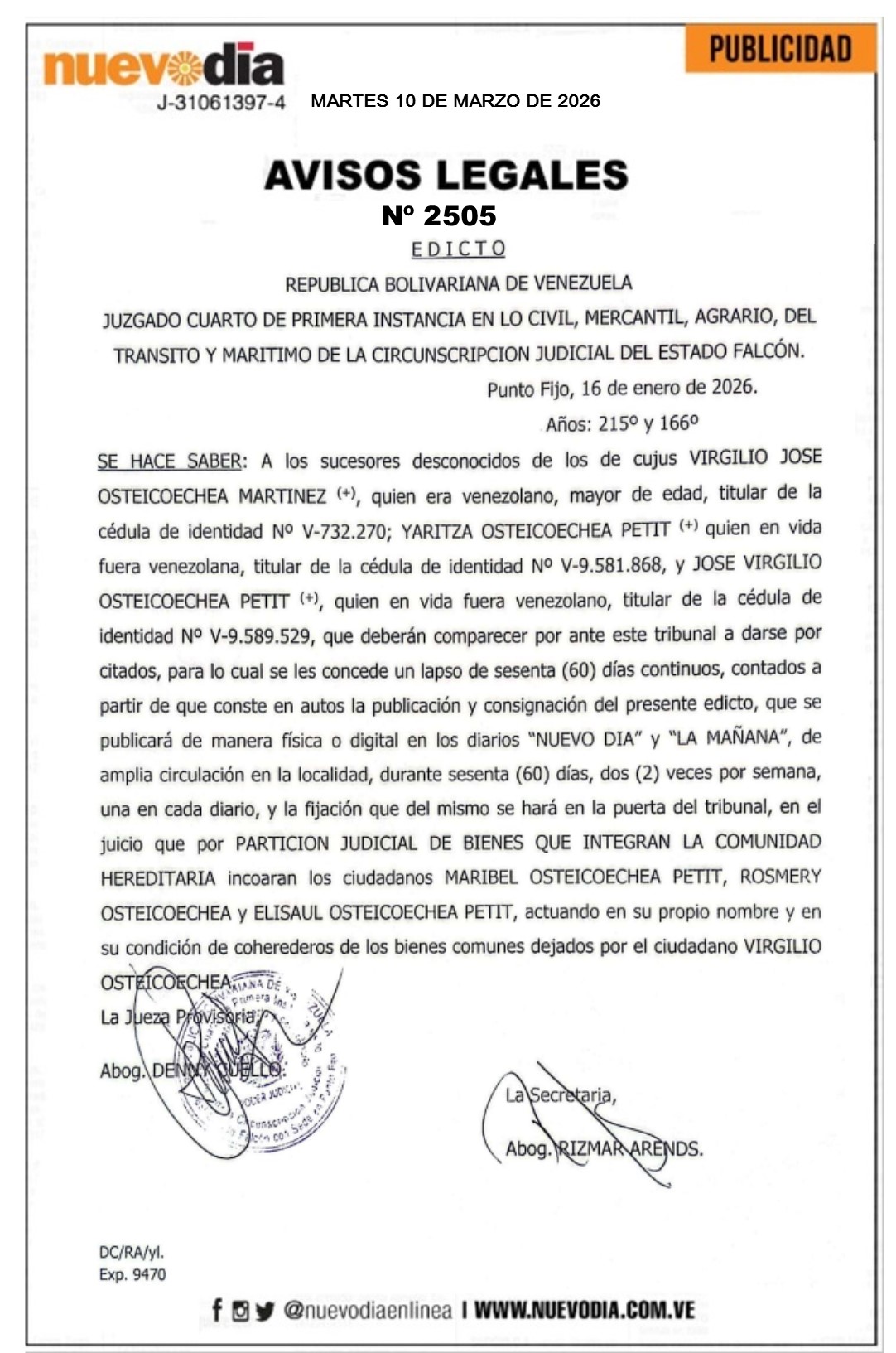 InicioPublicidadLegales PublicidadLegales Edicto.Virgilio José Osteicoechea Martínez,Yaritza Osteicoechea Petit y José Virgilio Osteicoechea Petit. 10/03/2026 FacebookTwitterPinterestWhatsApp 2505. 10-03-2026 Cuota FacebookTwitterPinterestWhatsApp Artículo anteriorPortada martes 10 de marzo de 2026Artículo siguienteEdicto.Francisco D’Sales Sandoval Rodríguez. Mercadeo NuevoDia Noticias Relacionadas Legales Edicto.Francisco D’Sales Sandoval Rodríguez. Legales Edicto.Wilfredo Antonio Martínez. Legales Cartel de Citación.Teofilo Helmut Sy Corvo. Redes Sociales20,299FansMe gusta112,425SeguidoresSeguir4,600SuscriptoresSuscribirte Últimas noticias Destacadas AN prorroga hasta el 13-Mar postulaciones para fiscal general y defensor del pueblo Destacadas Américo De Grazia recibe libertad plena por amnistía en Venezuela Cargar más