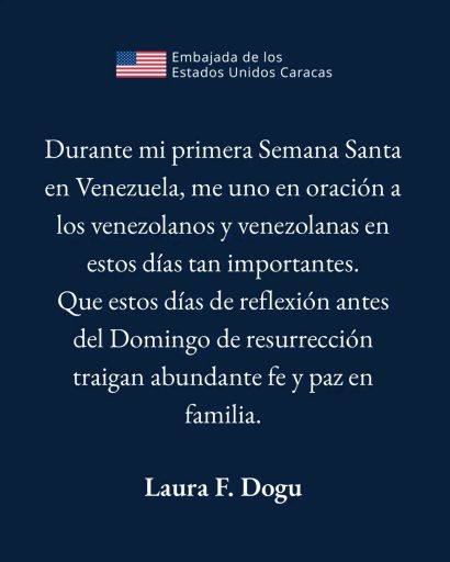 En el marco de las festividades religiosas propias de la Semana Santa, la jefa de Misión de la Embajada de los Estados Unidos para Venezuela, Laura Dogu, compartió un mensaje de fe y espiritualidad dirigido a todos los ciudadanos del país.