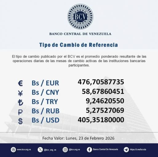 La tasa de cambio BCV al 23 de febrero de 2026 publicada por el Banco Central de Venezuela (BCV) se fijó en 405,3518 Bs/USD presentando un incremento de Bs. +3,0175 (+0,75%) con respecto a la jornada anterior.