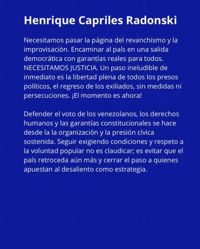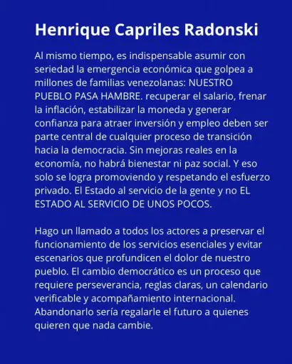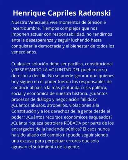 A juico de Capriles, en este momento de coyuntura en el país, es necesario pasar la página de revanchismo y la improvisación. Urge, escribió, encaminar al país a una salida democrática con garantías reales para todos.