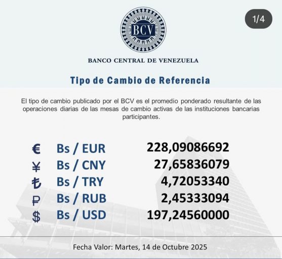 El precio del dólar al 14 de octubre de 2025 publicado por el Banco Central de Venezuela (BCV) se fijó en 197,2456 Bs/USD presentando un incremento de Bs. +1,9965 (+1,0225%) con respecto a la jornada anterior.