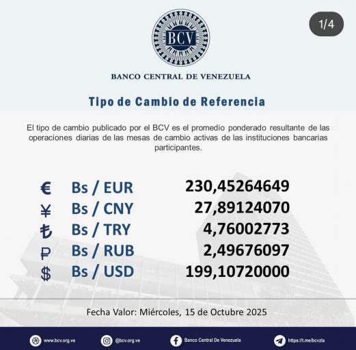 El precio del dólar al 15 de octubre de 2025 publicado por el Banco Central de Venezuela (BCV) se fijó en 199,1072 Bs/USD presentando un incremento de Bs. +1,8616 (+0,9438%) con respecto a la jornada anterior.