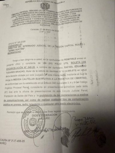 Rafael Tudares fue liberado la noche del miércoles como parte de una medida unilateral del gobierno venezolano y los esfuerzos realizados por la embajada de Suiza y la Arquidiócesis de Caracas. El medio digital AlbertoNews informó que el Tribunal Especial Tercero contra el Terrorismo dictó el 21 de enero de 2026 una medida cautelar sustitutiva, siendo acusado de presunta vinculación con operaciones que buscaban desestabilizar la seguridad nacional.