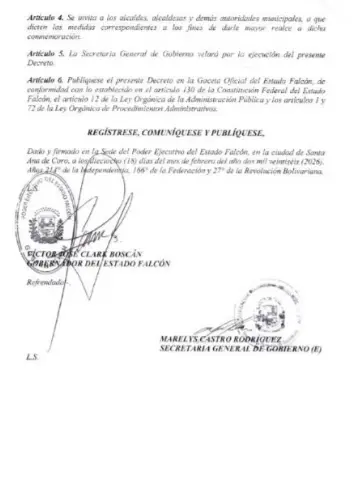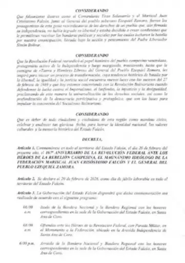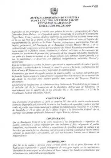 El Ejecutivo Regional emitió un decreto para informar a la colectividad falconiana que este viernes 20 de febrero, Día de la Federación, será de júbilo laborable.