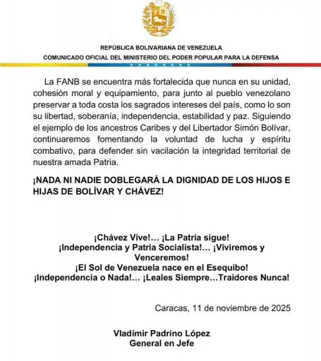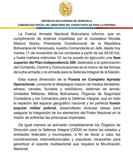 «De igual manera se activarán completamente los Órganos de Dirección para la Defensa Integral (ODDI) en todos los estados y entidades federales y municipales, a fin de llevar a cabo las coordinaciones interinstitucionales y populares necesarias para garantizar el soporte multisectorial que requiere la Movilización Nacional», imprime el comunicado firmado por el titular ministerial, Vladimir Padrino López.
