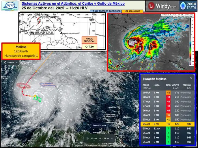 De tormenta tropical a huracán Melissa pasó este sábado 25 de octubre, según informó el Centro Nacional de Huracanes (NHC) de Florida. Este sistema alcanzó vientos sostenidos de 120 kilómetros por hora y continúa avanzando en dirección norte-noreste a través del mar Caribe.