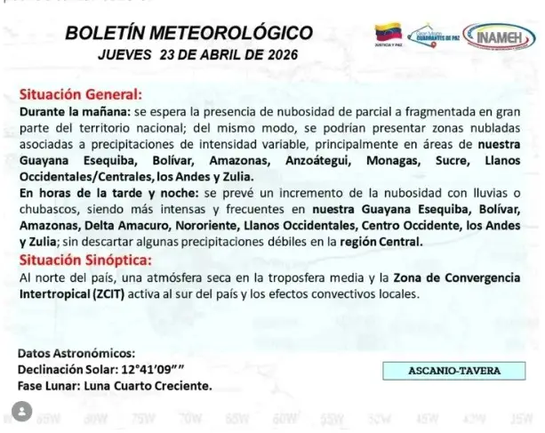 El Instituto Nacional de Meteorología e Hidrología (Inameh) informó que se espera en horas de la tarde y noche un incremento de nubosidad con lluvias, chubascos o fragmentada, en la Guayana Esequiba (zona de reclamación), Amazonas; Bolívar; Delta Amacuro; Llanos Occidentales; Nororiente; Centro Occidente; Zulia; Anzoátegui; Monagas; Sucre; Los Andes y Zulia; mientras que La Guaira, Miranda y Distrito Capital se estima que en la mañana predominará nubosidad tipo estratiforme con lloviznas intermitentes y que culminaría al final de la tarde.
