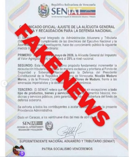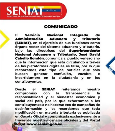 El organismo aclaró rotundamente que esta información es completamente falsa. Bajo la dirección del Superintendente Nacional, José David Cabello Rondón, el Seniat rechazó estas afirmaciones. El ente considera que son originadas con el propósito de sembrar confusión, incertidumbre y preocupación en la ciudadanía y los contribuyentes.