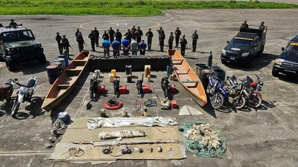 En el marco del operativo, cuatro personas vinculadas al tráfico de estupefacientes fueron detenidas. Los efectivos militares también confiscaron 10 escopetas de diversos calibres, un cargador, 13 cartuchos, un dispositivo GPS, cuatro radiotransmisores, una brújula y herramientas destinadas a la construcción de pistas clandestinas, entre ellas una excavadora y tres tractores. Además, se incautaron tres embarcaciones equipadas con cuatro motores y 2.000 litros de combustible.