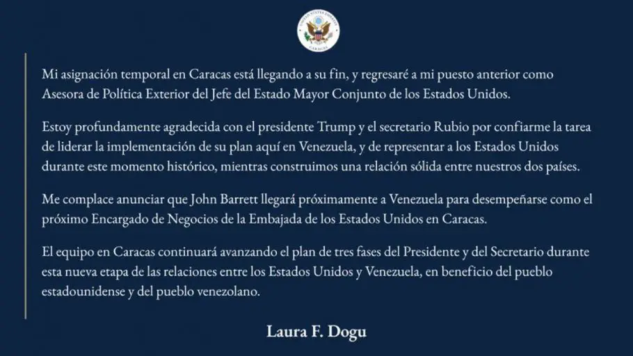 En un comunicado compartido a través de su cuenta oficial en X, Dogu, agradeció al presidente Donald Trump y al secretario Marco Rubio por confiarle la «tarea de liderar la implementación de su plan aquí en Venezuela, y de representar a los Estados Unidos durante este momento histórico, mientras construimos una relación sólida entre nuestros dos países».