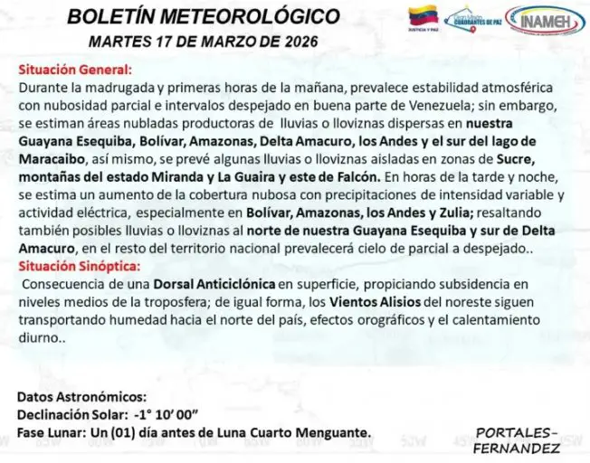 En el boletín emitido por el Instituto Nacional de Meteorología e Hidrología (Inameh) las autoridades indicaron que durante las primeras horas de la mañana de este martes, en buena parte del país prevalecerá estabilidad atmosférica con nubosidad parcial e intervalos despejados.