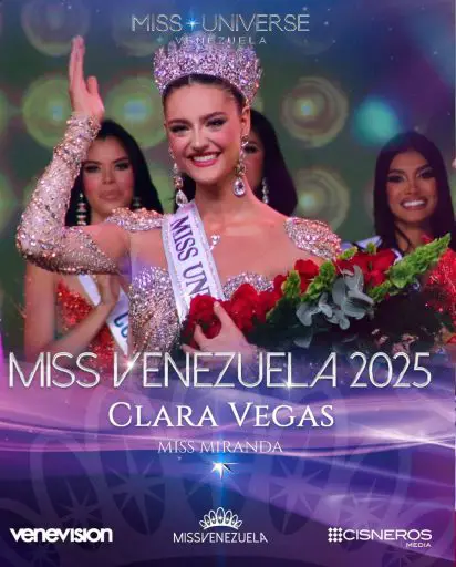 Clara Vegas Goetz, representante del estado Miranda, es la Miss Universe Venezuela 2025. El cuadro de cinco finalista lo completaron Amazonas (primera finalista), Mérida (2da finalistas), Yaracuy (3era finalista) y Monagas (4ta finalistas).