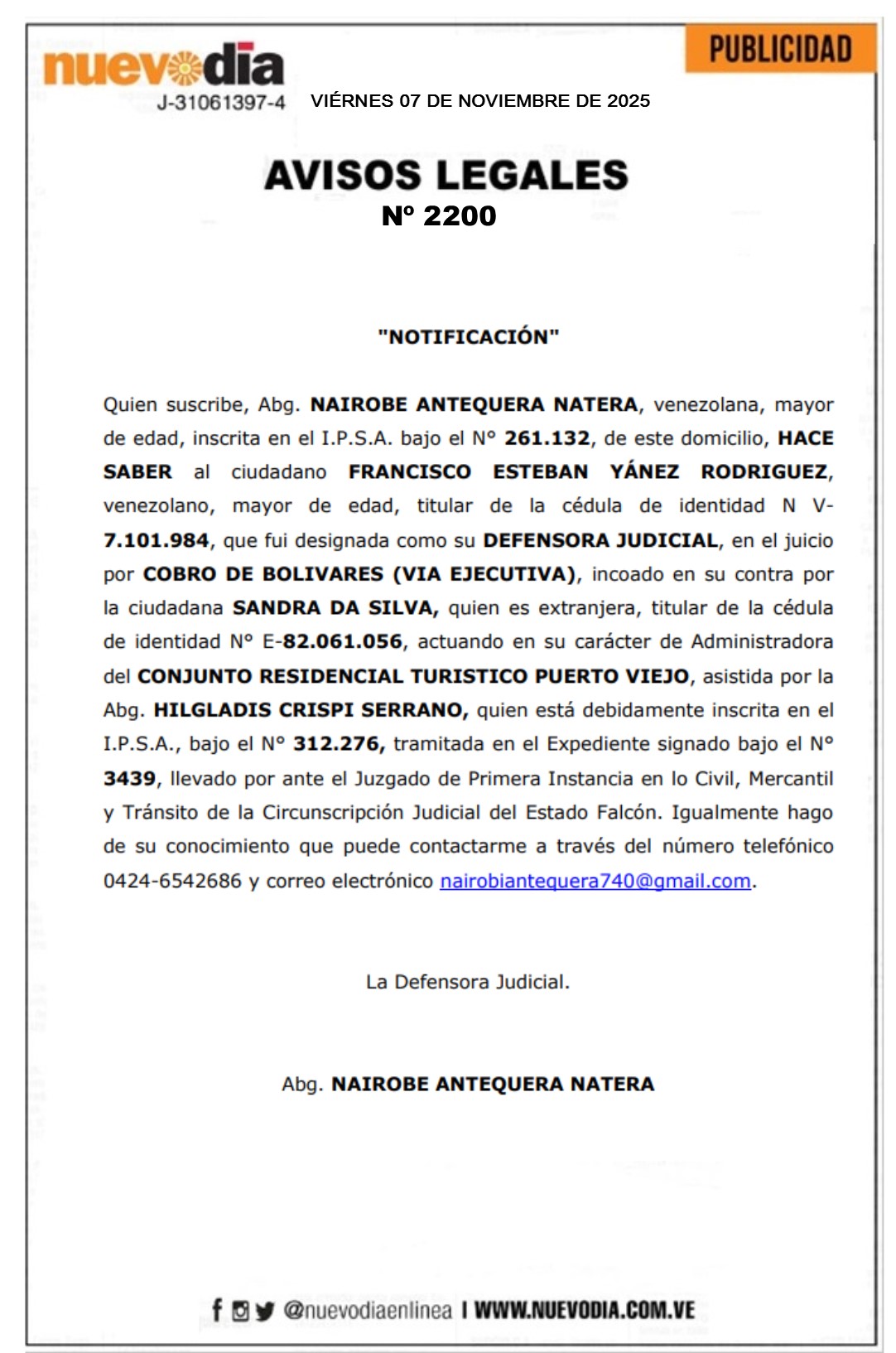 InicioPublicidadLegales PublicidadLegales Notificación.Francisco Esteban Yánez Rodríguez. 07/11/2025 FacebookTwitterPinterestWhatsApp 2200. 07-11-2025 Cuota FacebookTwitterPinterestWhatsApp Artículo anteriorGasto promedio por visita en centros comerciales ronda los $60Artículo siguienteCerca de 600.000 venezolanos perderán el TPS en EE.UU. este 7-Nov Mercadeo NuevoDia Noticias Relacionadas Legales Edicto.Nidia Chiquinquira Delgado. Legales Edicto.Flora Beatriz Loyo de Toyo, José Angel Toyo Acosta, José Antonio Toyo Loyo, Jésus Israel Toyo Loyo, Yoel Rafael Toyo Loyo, Henry Gregorio Toyo... Legales Edicto.Elida Rosa Rodríguez de Penso. Redes Sociales20,299FansMe gusta112,425SeguidoresSeguir4,600SuscriptoresSuscribirte Últimas noticias Destacadas Incautan 1.253 kilos de súper marihuana en Lara +DETALLES Destacadas Gasto promedio por visita en centros comerciales ronda los $60 Cargar más