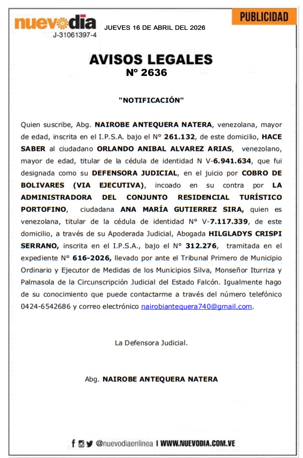 InicioPublicidadLegales PublicidadLegales Notificación.Orlando Anibal Alvarez Arias. 16/04/2026 FacebookTwitterPinterestWhatsApp 2636. 16-04-2026 Cuota FacebookTwitterPinterestWhatsApp Artículo anteriorCoro | Emiten decreto que regula circulación de las motos hasta las 11 de la nocheArtículo siguienteHomicidio en Mauroa | Lo asesinaron y se llevaron el cadáver Mercadeo NuevoDia Noticias Relacionadas Legales Edicto.Dinna Milagros Lugo Jiménez, Andrés Lugo Jiménez, Michele Jesús Lugo Jiménez y Miriam del Valle Lugo de Atacho. Legales Edicto.Nerys Julian Piña. Legales Convocatoria.Accionistas A y B.Asamblea Ordinaria de Socios.Clínica Virgen de Guadalupe. Redes Sociales20,299FansMe gusta112,425SeguidoresSeguir4,600SuscriptoresSuscribirte Últimas noticias Destacadas Delcy Rodríguez: recursos congelados en el FMI se usarán en la recuperación de los servicios públicos Destacadas Designan a Carlos Alvarado como nuevo ministro de Salud Cargar más