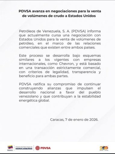 El comunicado oficial, fechado en Caracas el 7 de enero de 2026, confirma el anuncio realizado el día anterior por el presidente de Estados Unidos, Donald Trump, quien aseguró que las autoridades interinas de Venezuela entregarán entre 30 y 50 millones de barriles de crudo sancionado a su país.
