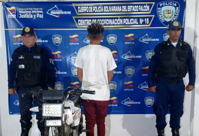Después de las 10 de la noche de este lunes 22 de diciembre fue aprehendido, por la Policía del estado Falcón, un motorizado con antecedentes. El sujeto se desplazaba en una moto solicitada por el delito de hurto.
