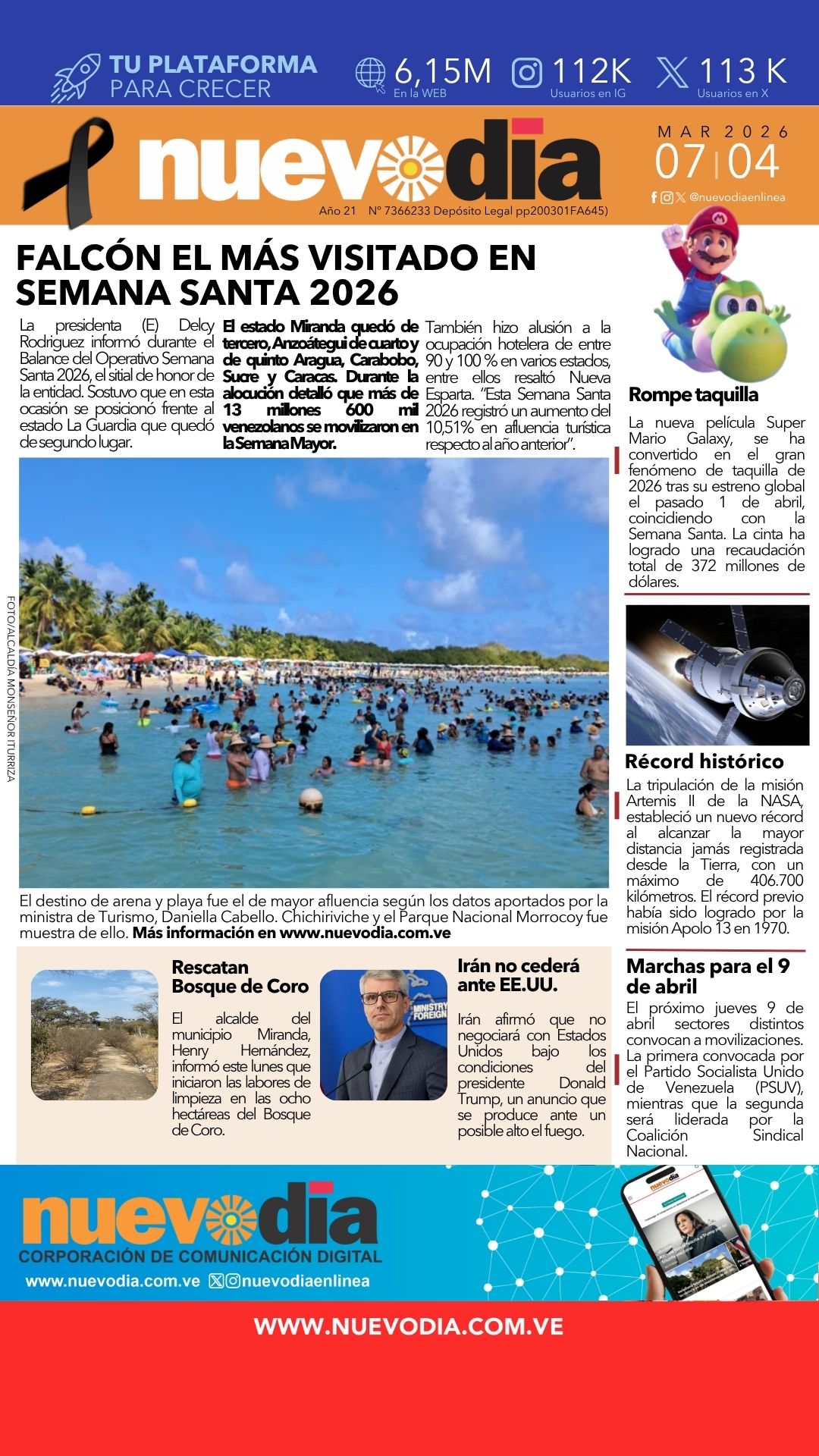 InicioPortadas Portadas Portada 07 de abril de 2026 07/04/2026 FacebookTwitterPinterestWhatsApp Cuota FacebookTwitterPinterestWhatsApp Artículo anteriorRiesgo de demencia en ancianos se reduce en un 30% al cocinar en casa Josmary EscalonaPeriodista principalmente de la fuente política que también hace diarismo, entrevistas y trabajos especiales sobre temas que la población desea conocer. Noticias Relacionadas Portadas Portada lunes 6 de abril de 2026 Portadas Portada viernes 3 de abril de 2026 Portadas Primera del 2 de abril de 2026 Redes Sociales20,299FansMe gusta112,425SeguidoresSeguir4,600SuscriptoresSuscribirte Últimas noticias Destacadas Más de 13 millones de personas se movilizaron durante asueto de Semana Santa Destacadas Diosdado Cabello: Maduro y Cilia van a estar pronto de vuelta en Venezuela Cargar más