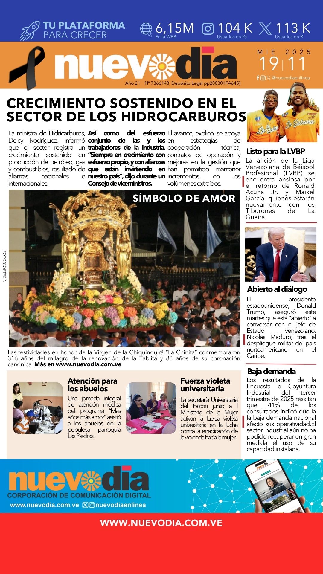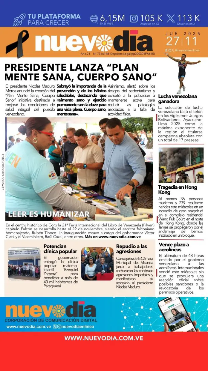 InicioPortadas Portadas Portada 27 de noviembre de 2025 27/11/2025 FacebookTwitterPinterestWhatsApp Cuota FacebookTwitterPinterestWhatsApp Artículo anteriorLas páginas de la 21ª Filven se abrieron en Falcón Josmary EscalonaPeriodista principalmente de la fuente política que también hace diarismo, entrevistas y trabajos especiales sobre temas que la población desea conocer. Noticias Relacionadas Portadas Portada miércoles 26 de noviembre de 2025 Portadas Portada martes 25 de noviembre de 2025 Portadas Portada del 21 de noviembre de 2025 Redes Sociales20,299FansMe gusta112,425SeguidoresSeguir4,600SuscriptoresSuscribirte Últimas noticias Destacadas Vence el plazo del gobierno nacional sin que las aerolíneas retomen sus operaciones Nacionales Estudiante de Medicina lanza la primera app educativa de Neurociencias del país Cargar más