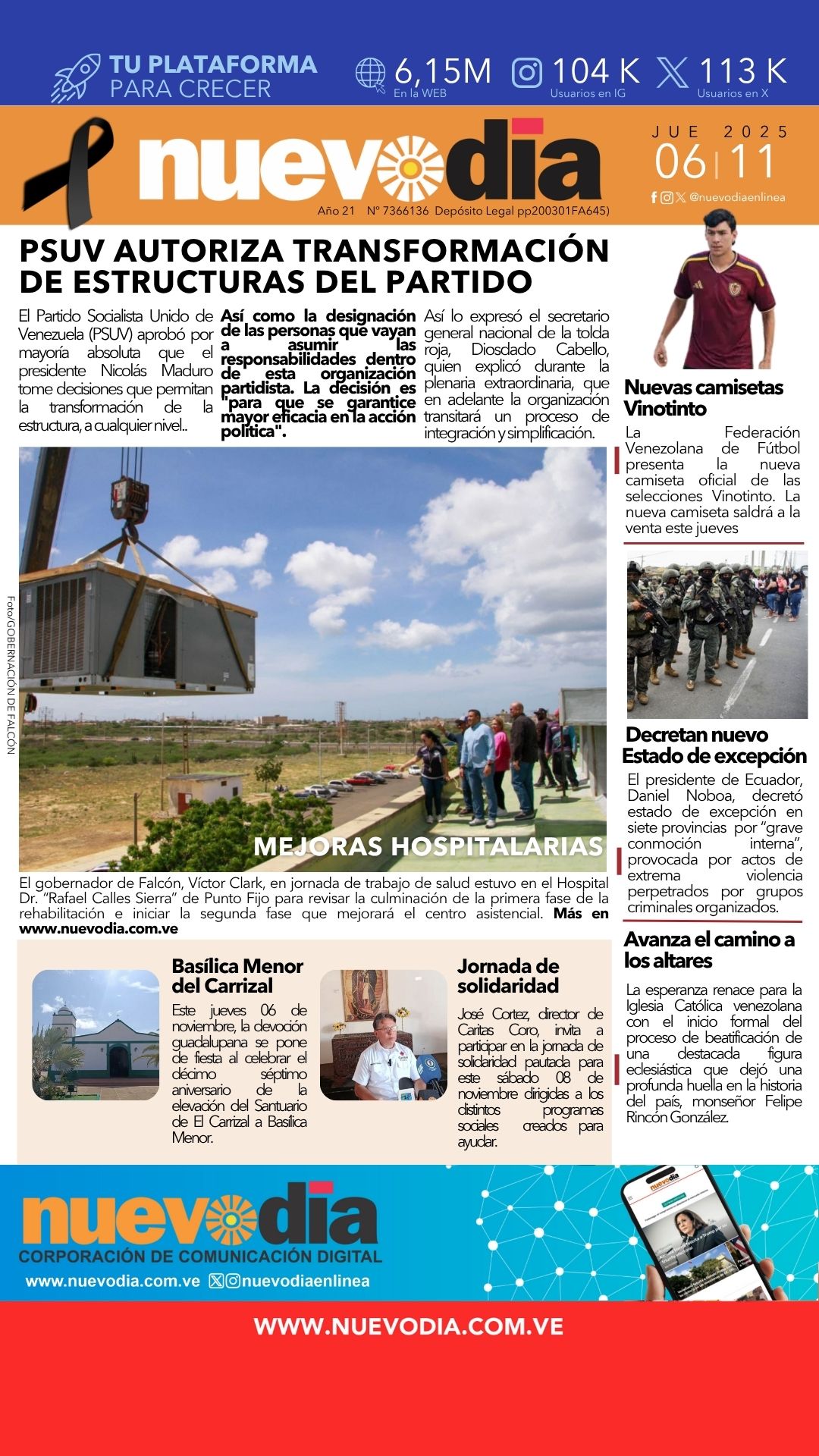 InicioPortadas Portadas Portada del 06 de noviembre de 2025 06/11/2025 FacebookTwitterPinterestWhatsApp Cuota FacebookTwitterPinterestWhatsApp Artículo anteriorAsí avanza el camino a los altares de monseñor Felipe Rincón González Josmary EscalonaPeriodista principalmente de la fuente política que también hace diarismo, entrevistas y trabajos especiales sobre temas que la población desea conocer. Noticias Relacionadas Portadas Portada miércoles 5 de noviembre de 2025 Portadas Portada martes 4 de noviembre de 2025 Portadas Portada del 31 de octubre de 2025 Redes Sociales20,299FansMe gusta112,425SeguidoresSeguir4,600SuscriptoresSuscribirte Últimas noticias Destacadas Así avanza el camino a los altares de monseñor Felipe Rincón González Destacadas Venezuela busca acuerdo «arancel cero» con China para 400 productos Cargar más
