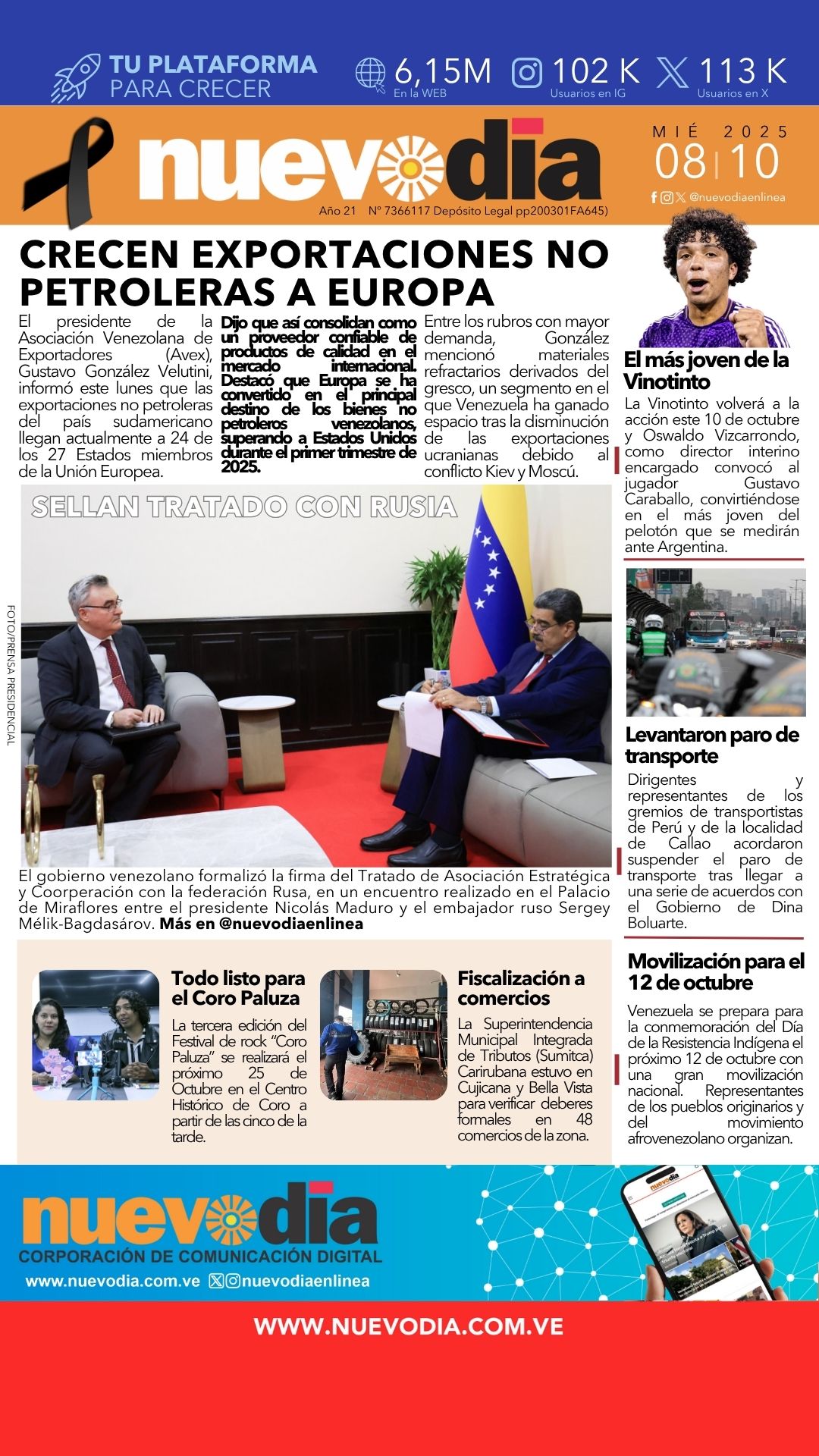 InicioPortadas Portadas Portada del 08 de octubre de 2025 08/10/2025 FacebookTwitterPinterestWhatsApp Cuota FacebookTwitterPinterestWhatsApp Artículo anteriorServando y Florentino listos para su tour mundial 2025-2026 Josmary EscalonaPeriodista principalmente de la fuente política que también hace diarismo, entrevistas y trabajos especiales sobre temas que la población desea conocer. Noticias Relacionadas Portadas Portada martes 7 de octubre de 2025 Portadas Portada viernes 3 de octubre de 2025 Portadas Portada jueves 02 de octubre de 2025 Redes Sociales20,299FansMe gusta112,425SeguidoresSeguir4,600SuscriptoresSuscribirte Últimas noticias Destacadas Día de la Resistencia Indígena el 12 de octubre tendrá movilización nacional Destacadas Activan la Operación Luisa Cáceres de Arismendi ¿De qué se trata? Cargar más