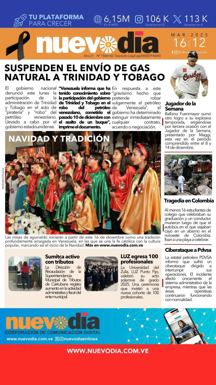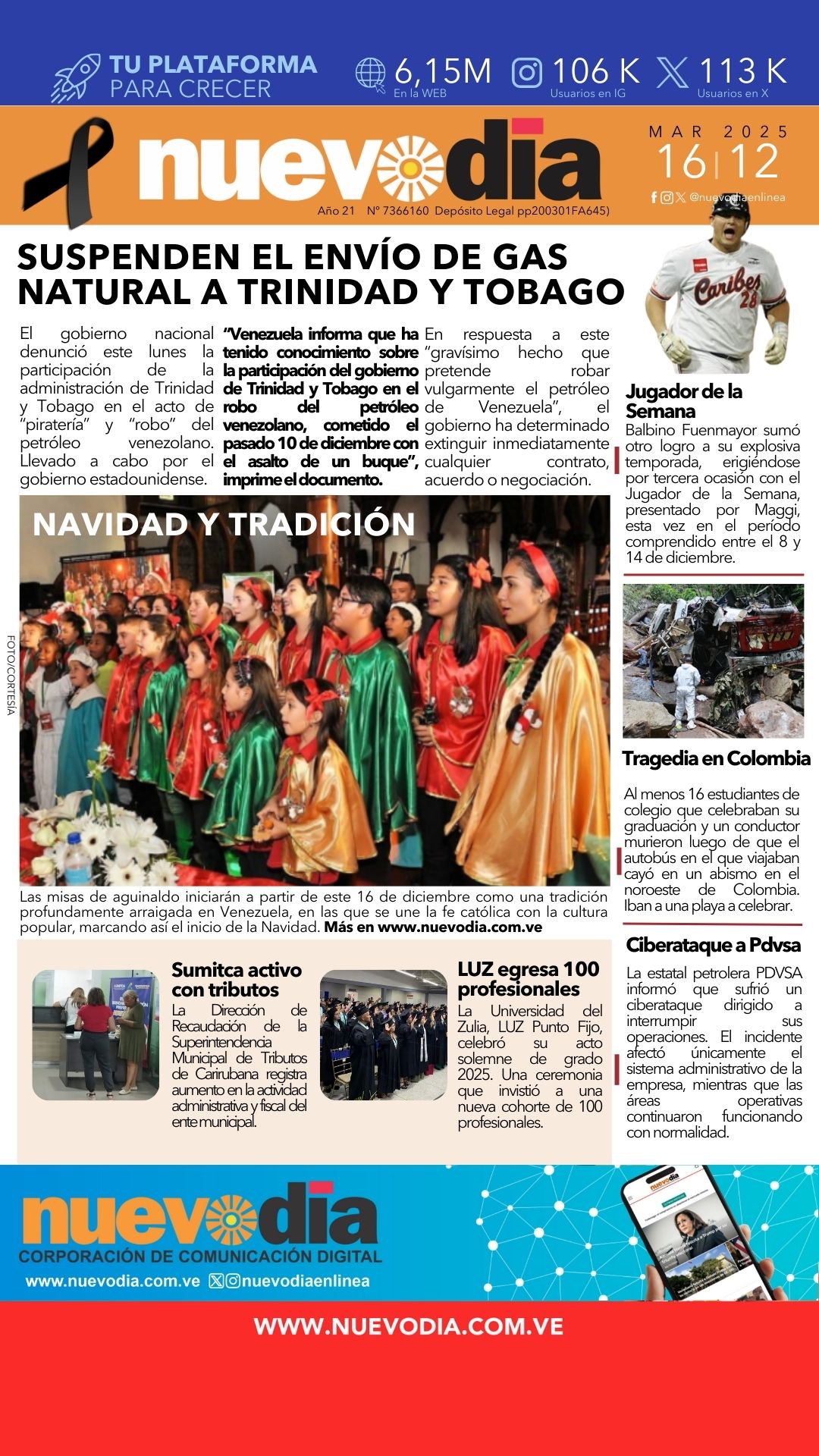 InicioPortadas Portadas Portada del 16 de diciembre de 2025 16/12/2025 FacebookTwitterPinterestWhatsApp Cuota FacebookTwitterPinterestWhatsApp Artículo anteriorEnfermera infectó a más de 70 personas con hepatitis C y VIH en RusiaArtículo siguienteEdicto.José Gregorio Loyo Leal. Josmary EscalonaPeriodista principalmente de la fuente política que también hace diarismo, entrevistas y trabajos especiales sobre temas que la población desea conocer. Noticias Relacionadas Portadas Portada lunes 15 de diciembre de 2025 Portadas Portada del 12 de diciembre de 2025 Portadas Portada jueves 11 de diciembre de 2025 Redes Sociales20,299FansMe gusta112,425SeguidoresSeguir4,600SuscriptoresSuscribirte Últimas noticias Destacadas 16-Dic | Así está el precio del dólar en Venezuela Destacadas Venezuela suspende el envío de gas natural a Trinidad y Tobago (COMUNICADO) Cargar más